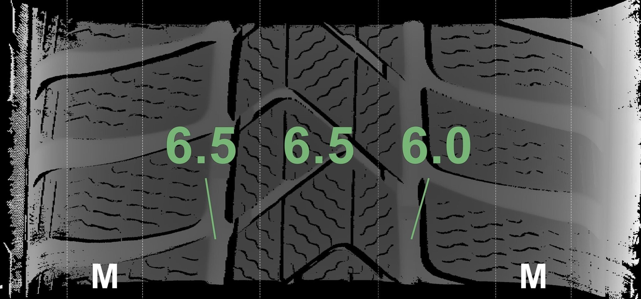Zustand | Profiltiefe | DOT | Vorderachse Links | Gebraucht | 6,5 mm | 4718 |