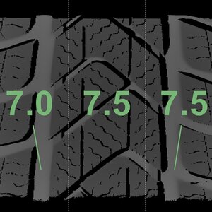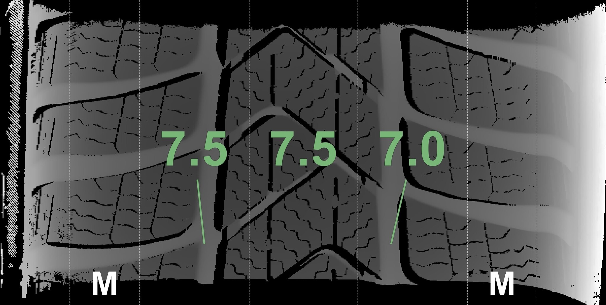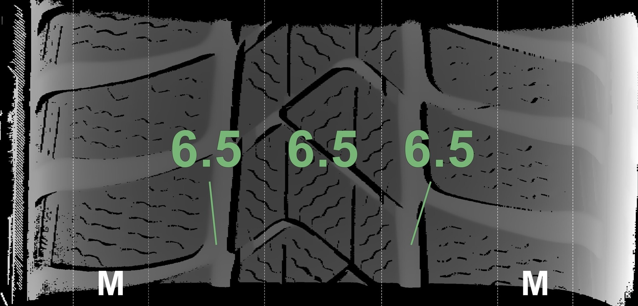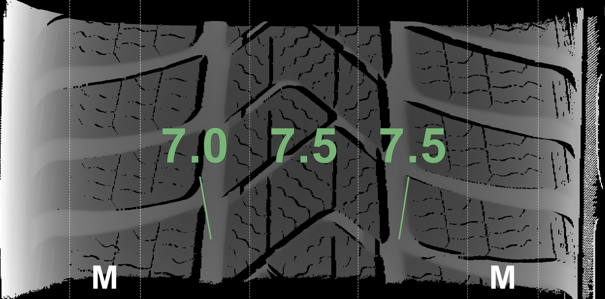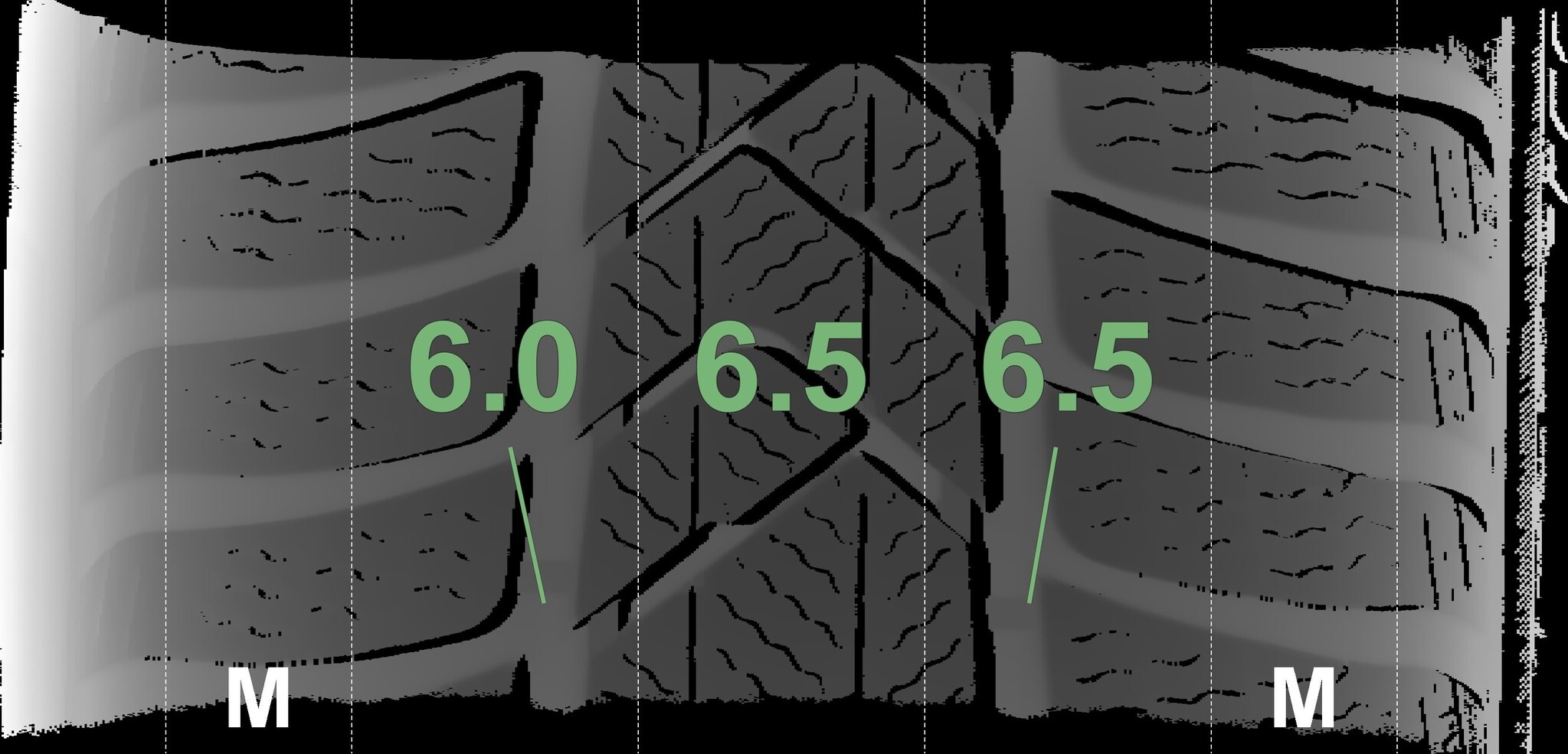 Die gemessenen Profiltiefen und die Details der Felgen sind oben dargestellt.