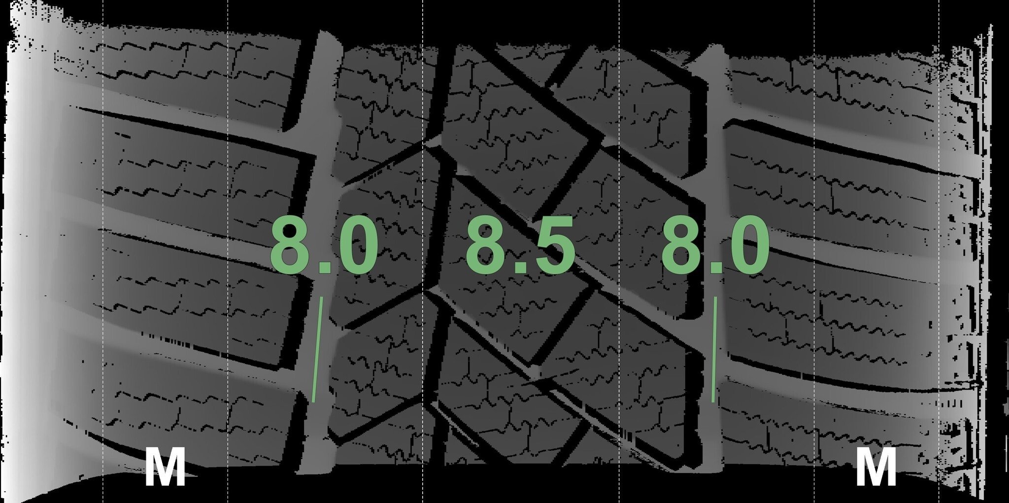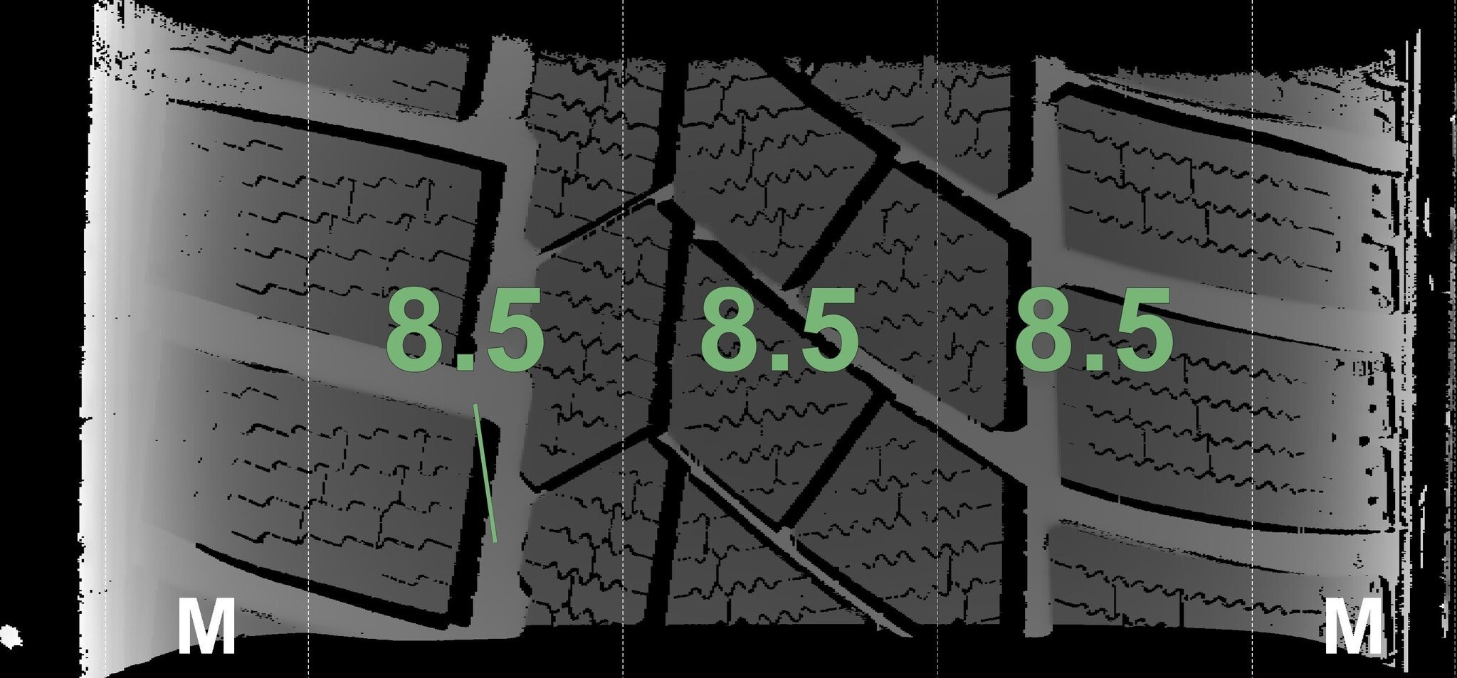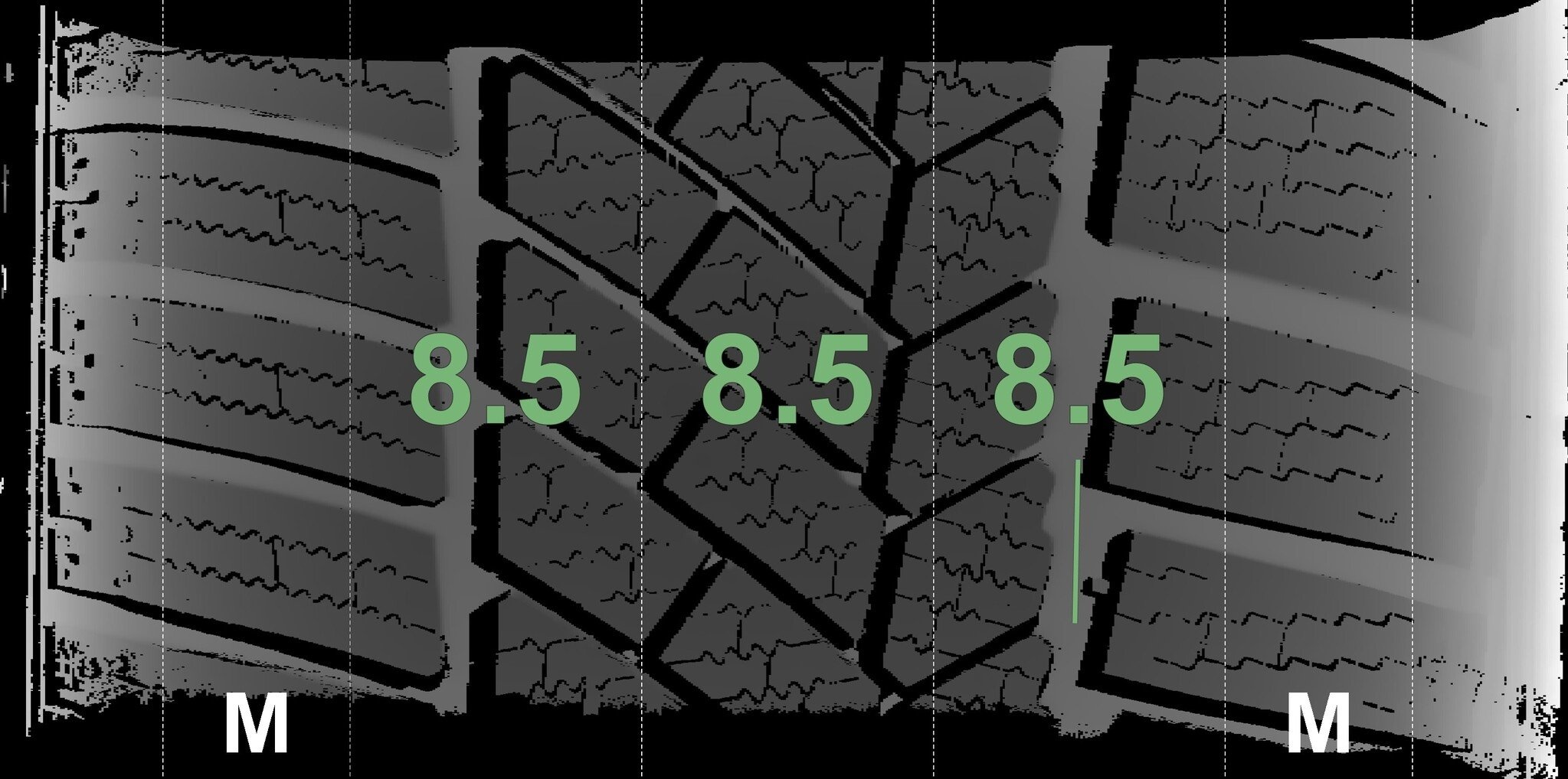 | Zustand | Profiltiefe | DOT | Vorderachse Links | Neu | 8,5 mm | 3325 |