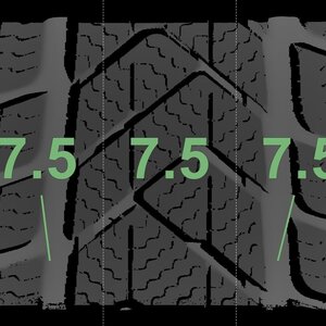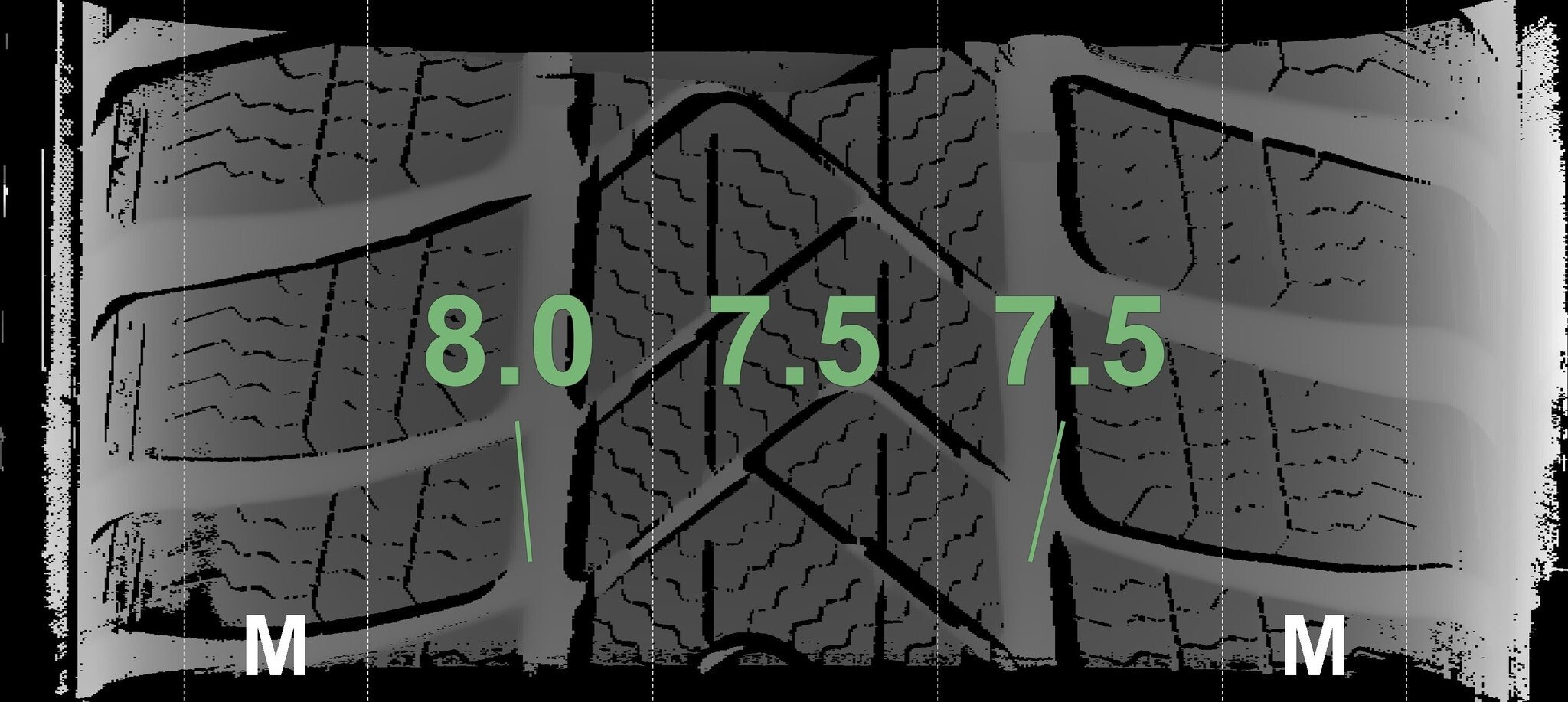 | Zustand | Profiltiefe | DOT | Vorderachse Links | Neu | 7,5 mm | 2620 |
