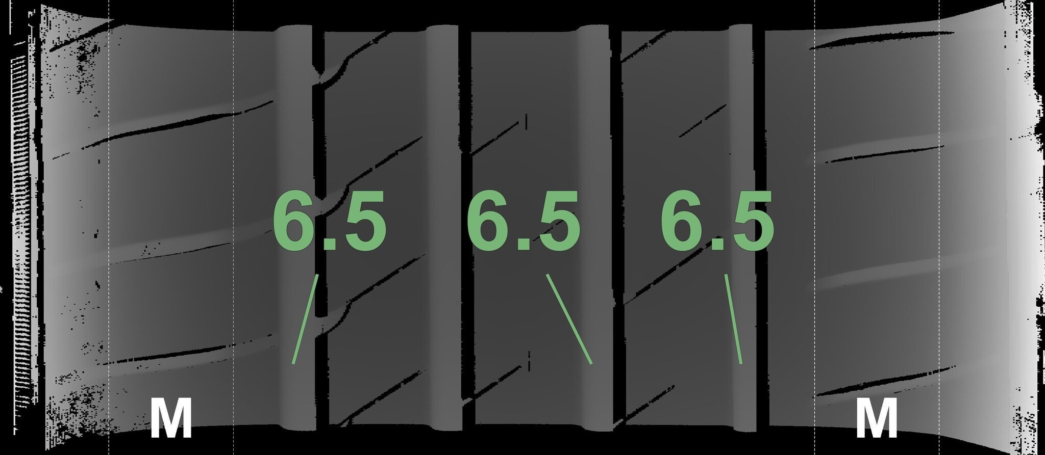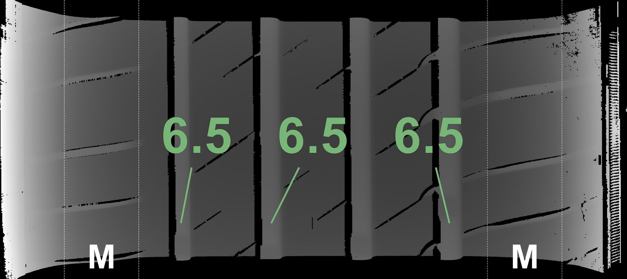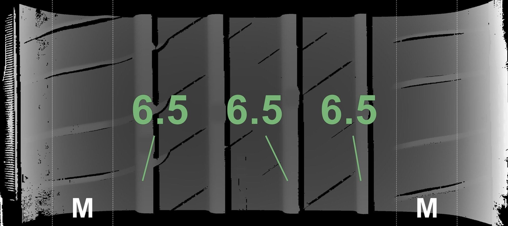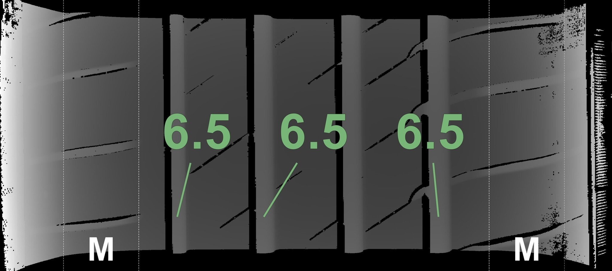 | Zustand | Profiltiefe | DOT | Vorderachse Rechts | Demo-Noppen noch sichtbar | 6,5 mm | 0424 |