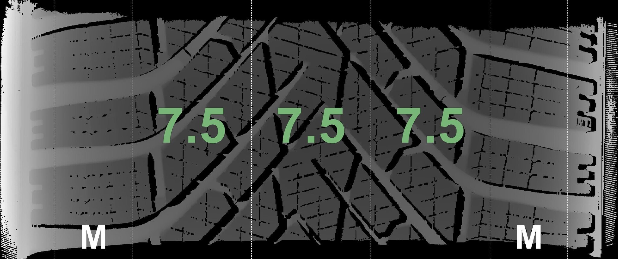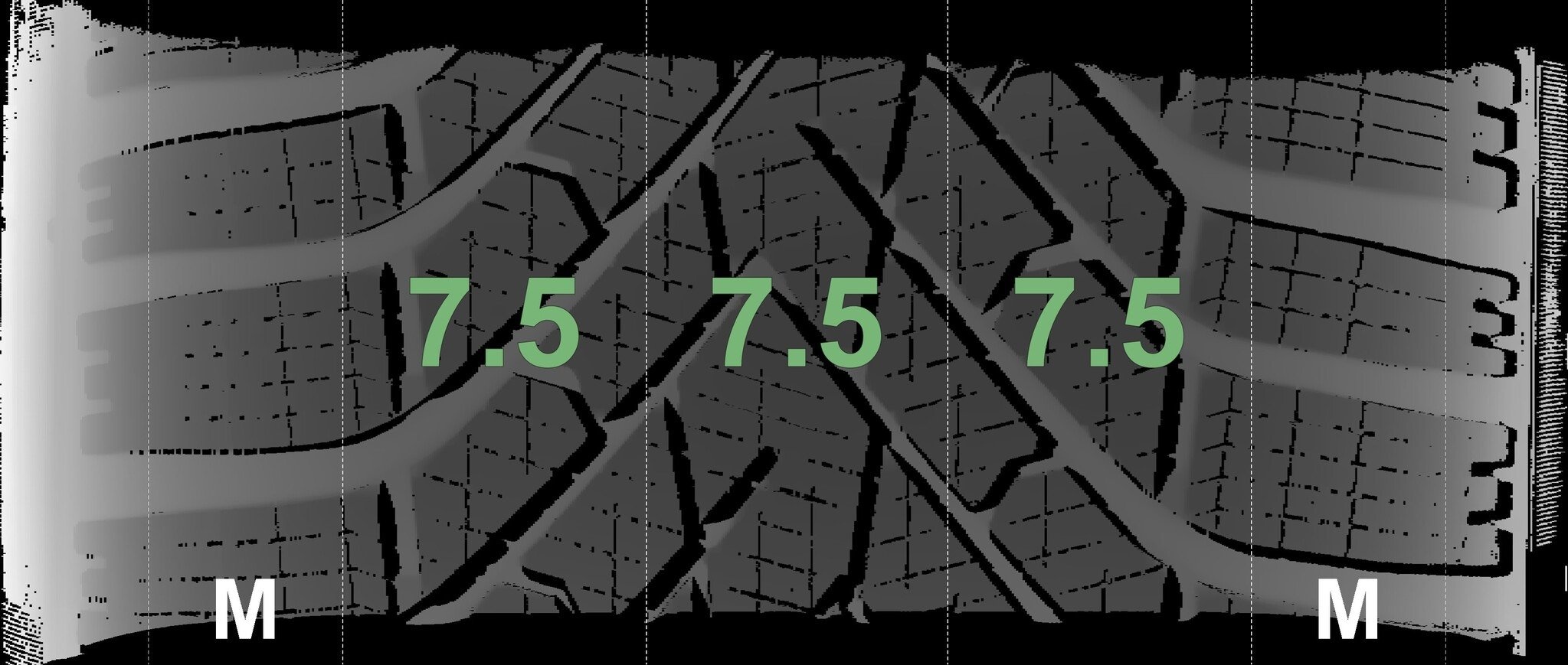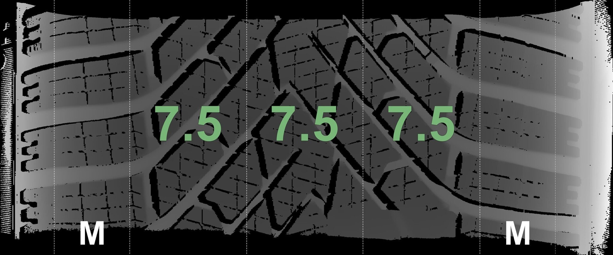 | Zustand | Profiltiefe | DOT | Vorderachse Links | Neu | 7.5 mm | 3725 |