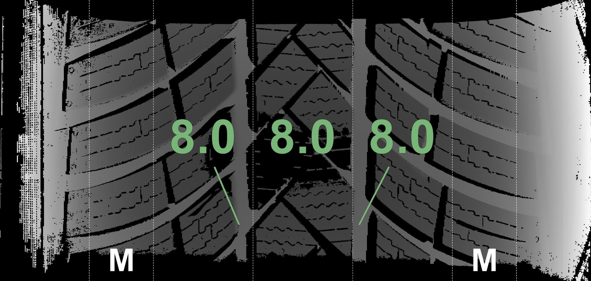 Zustand | Profiltiefe | DOT | Hinterachse Links | Neu | 8,0 mm | 1925 |