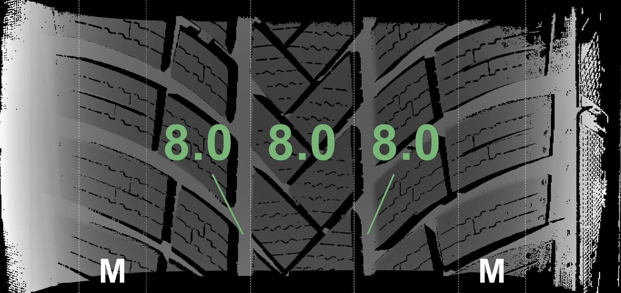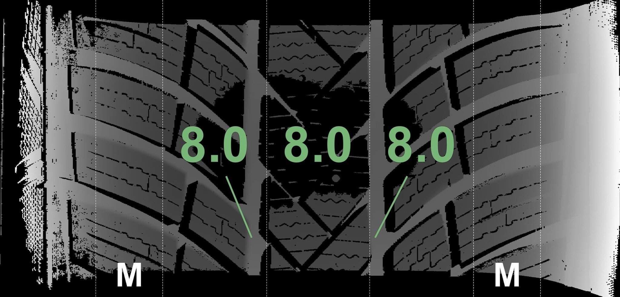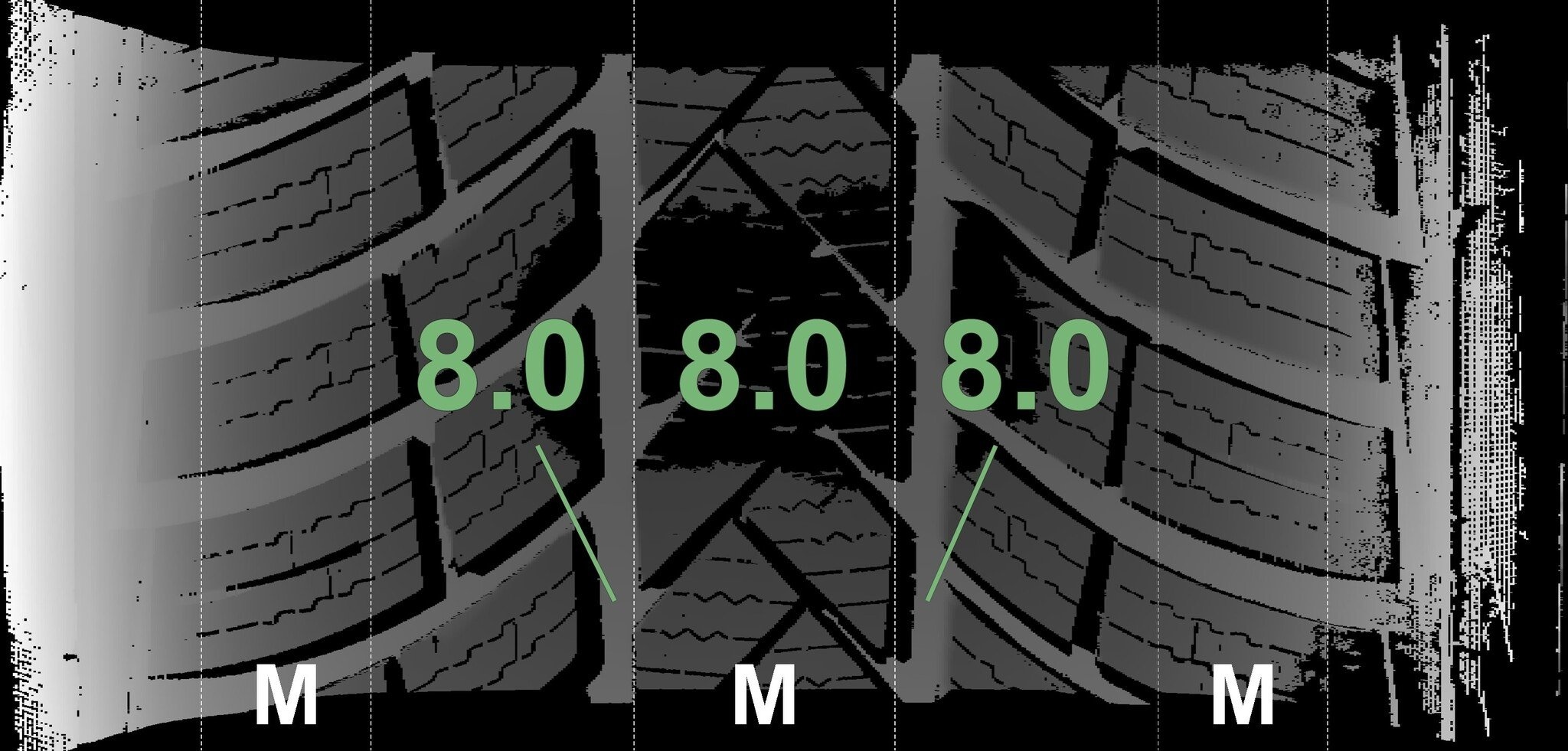 Zustand | Profiltiefe | DOT | Vorderachse Links | Neu | 8,0 mm | 1925 |