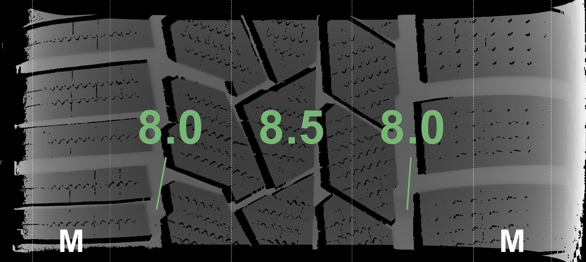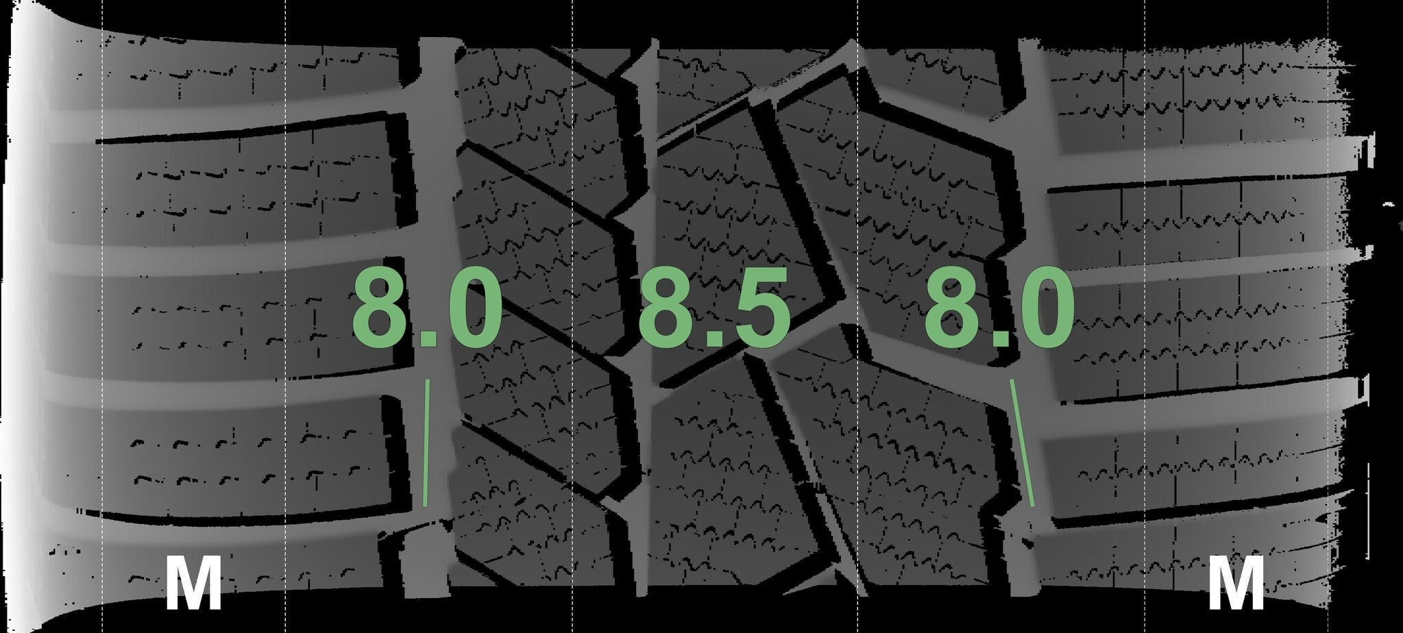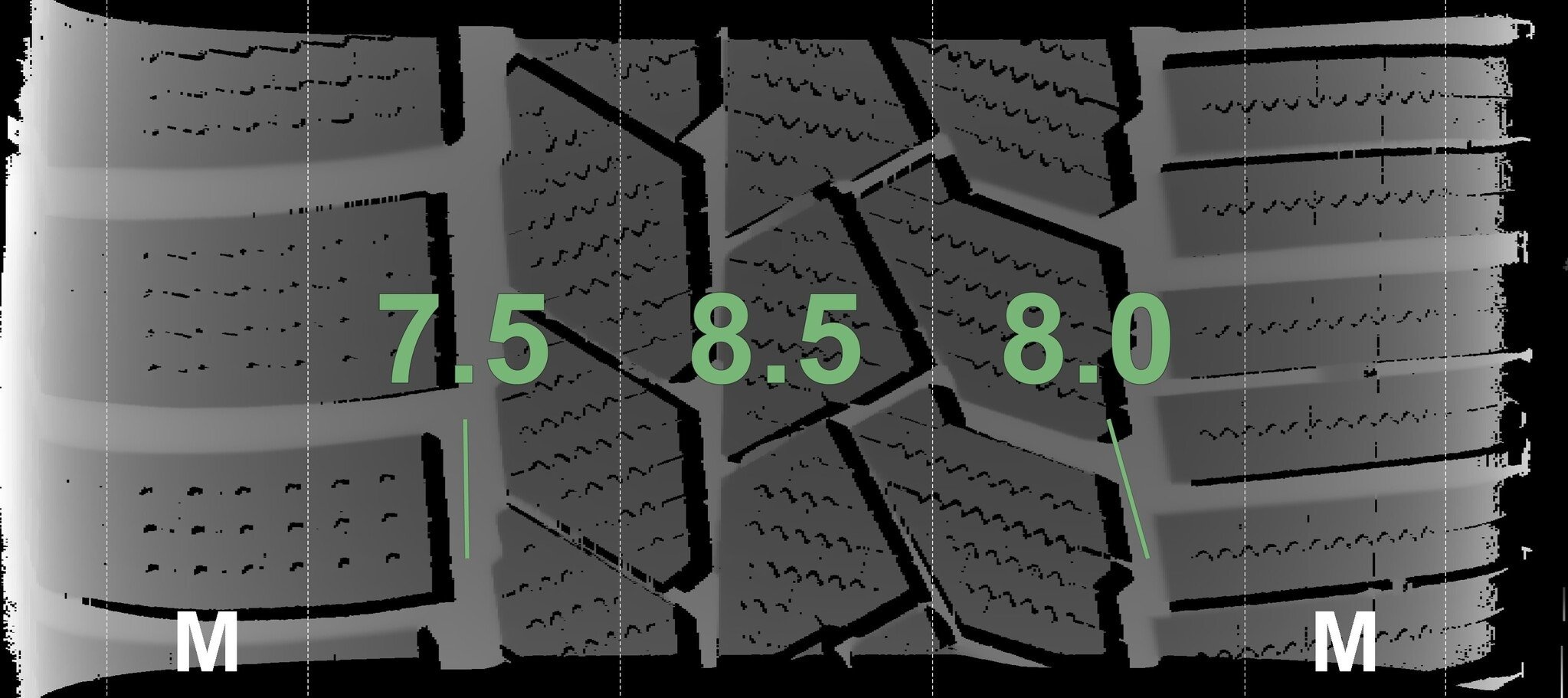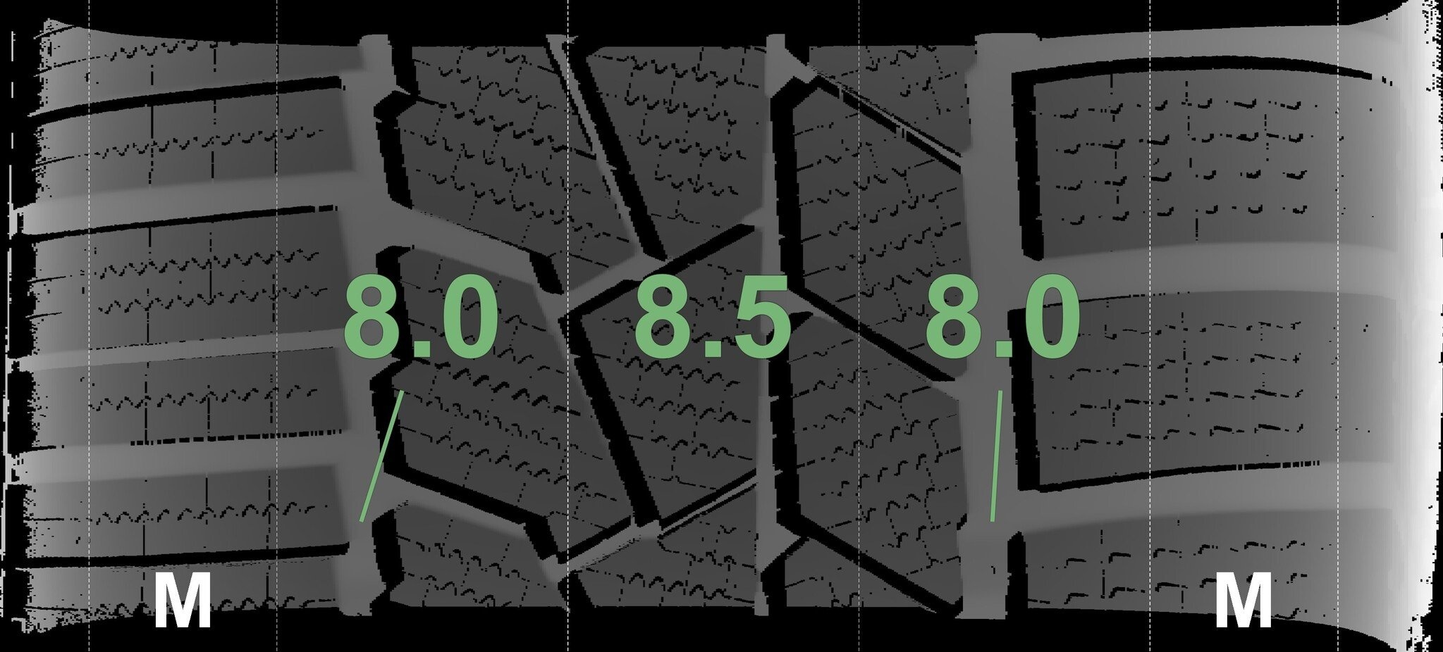 Die gemessenen Profiltiefen und die Details der Felgen sind oben angegeben.