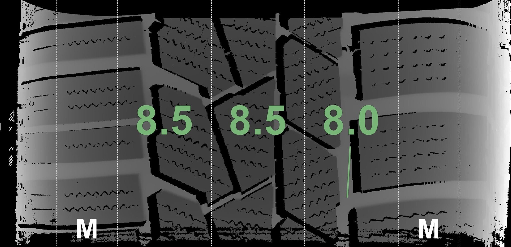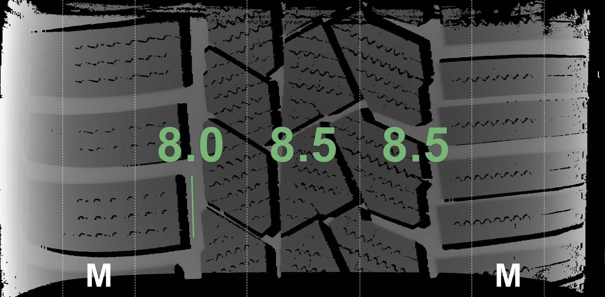 | Zustand | Profiltiefe | DOT | Hinterachse Links | Demo-Noppen noch sichtbar | 8.3 mm | 2223 |