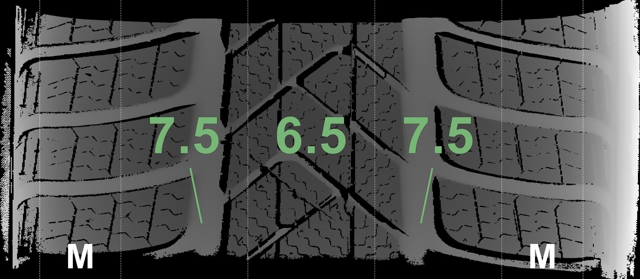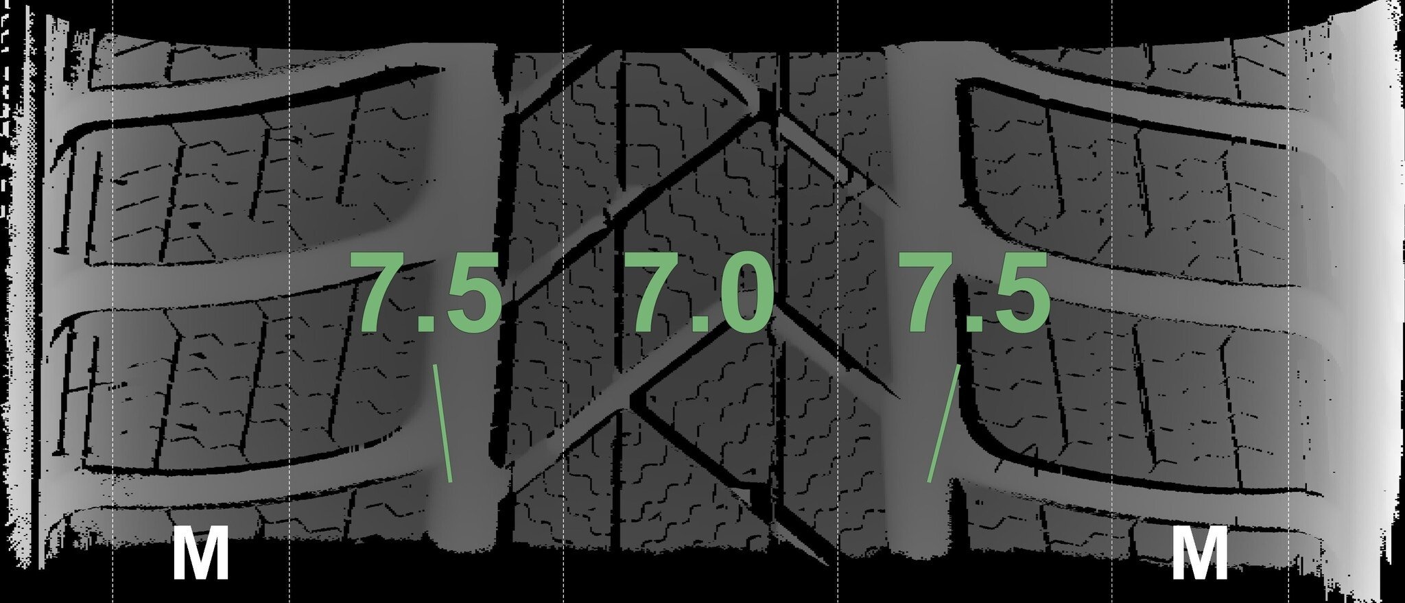 Die gemessenen Profiltiefen und die Details der Felgen sind oben dargestellt.