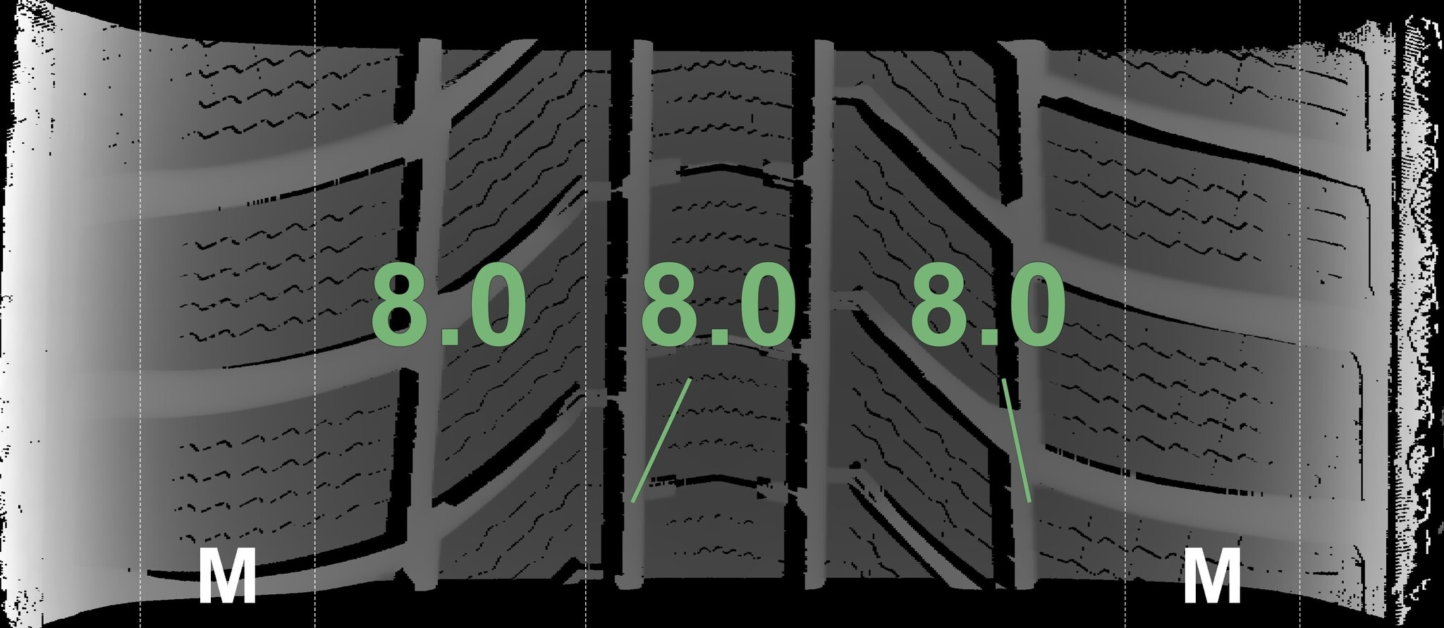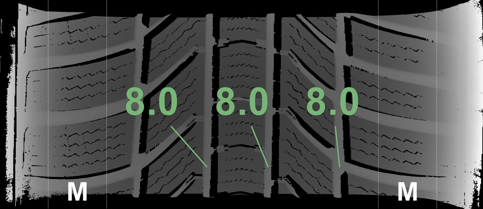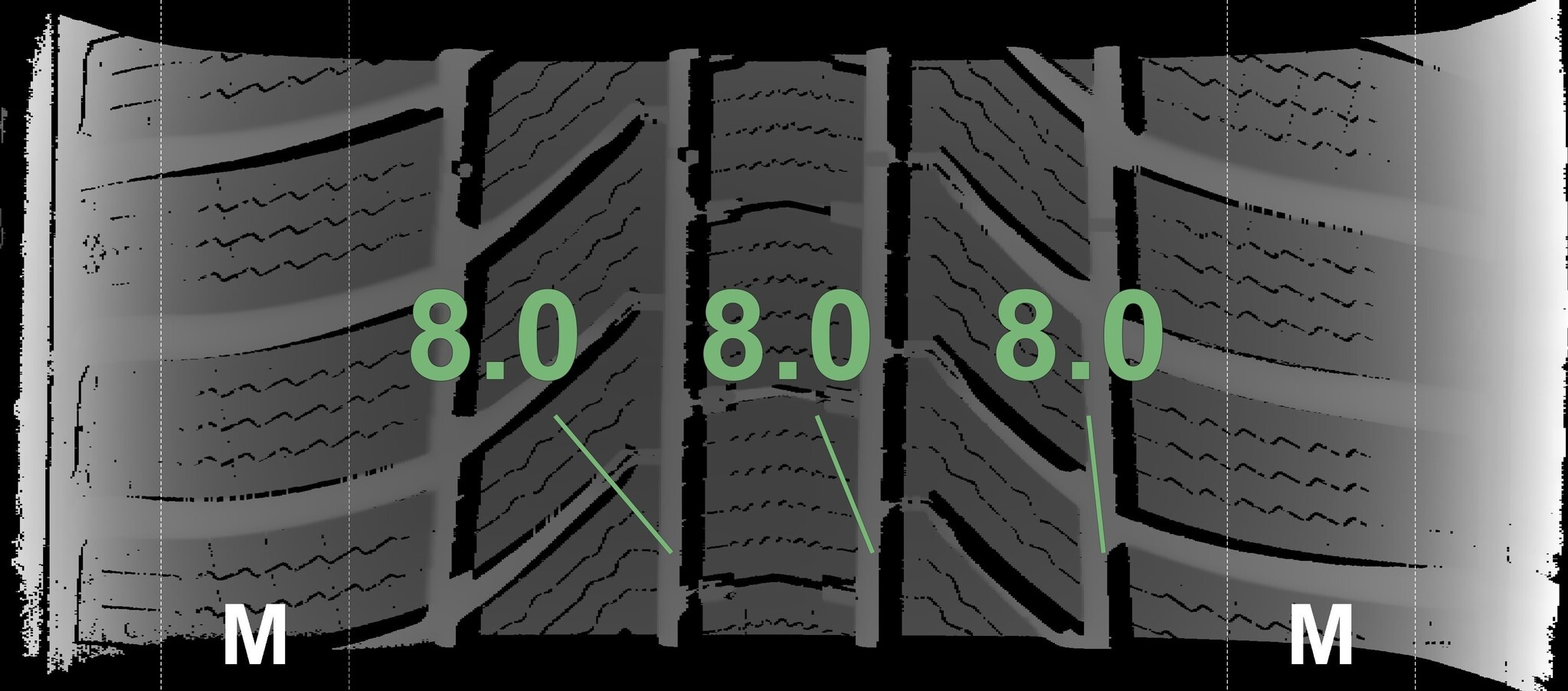 | Zustand | Profiltiefe | DOT | Vorderachse Links | Demobolzen noch sichtbar | 8,0 mm | 1724 |