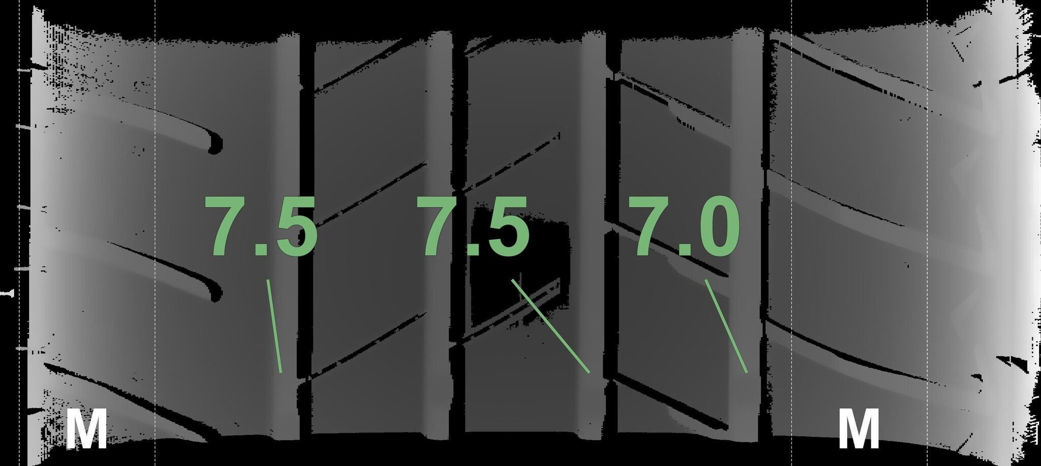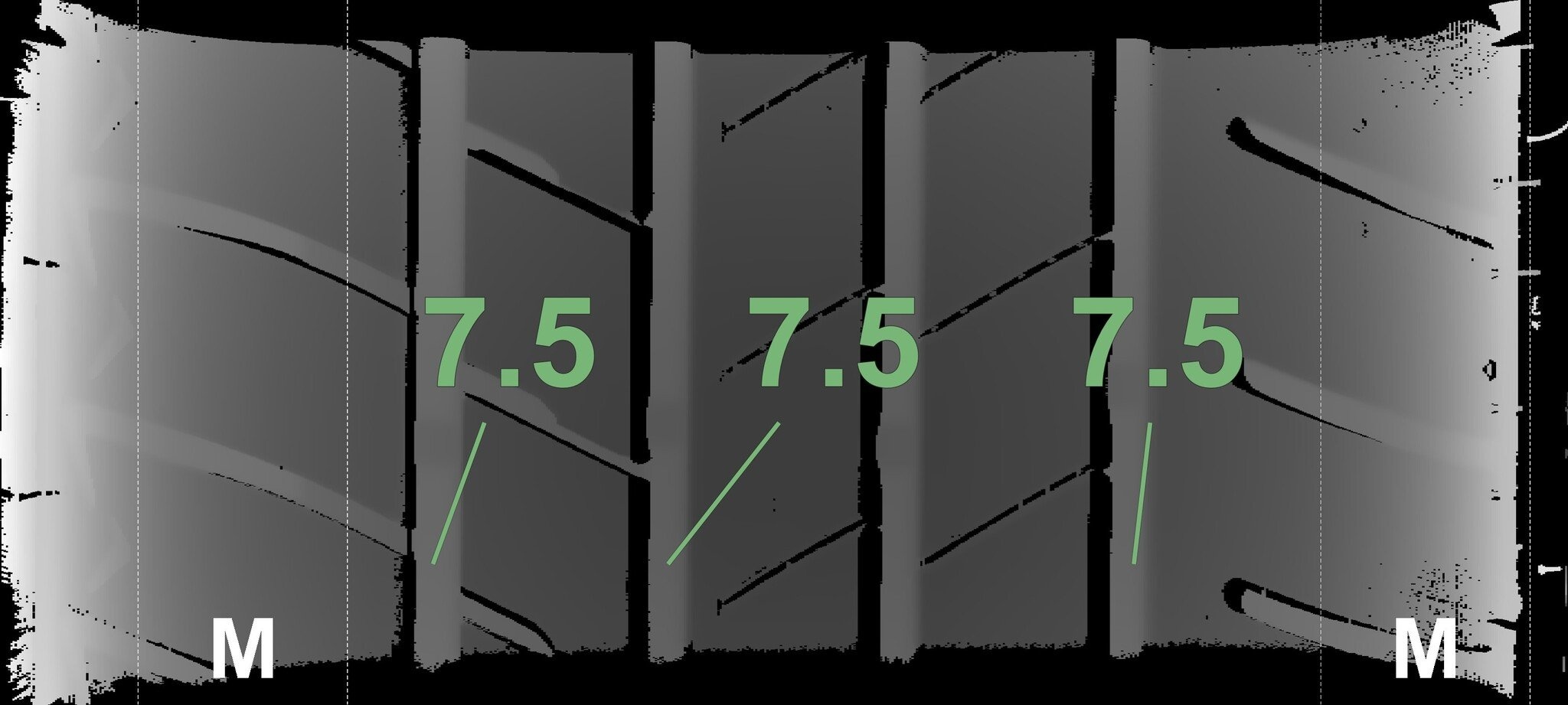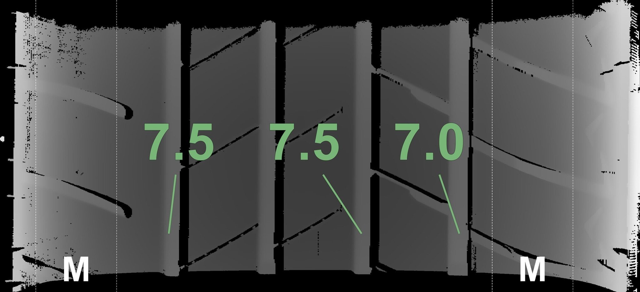 Zustand | Profiltiefe | DOT | Hinterachse Links | Demo-Noppen noch sichtbar | 7,5 mm | 0523 |