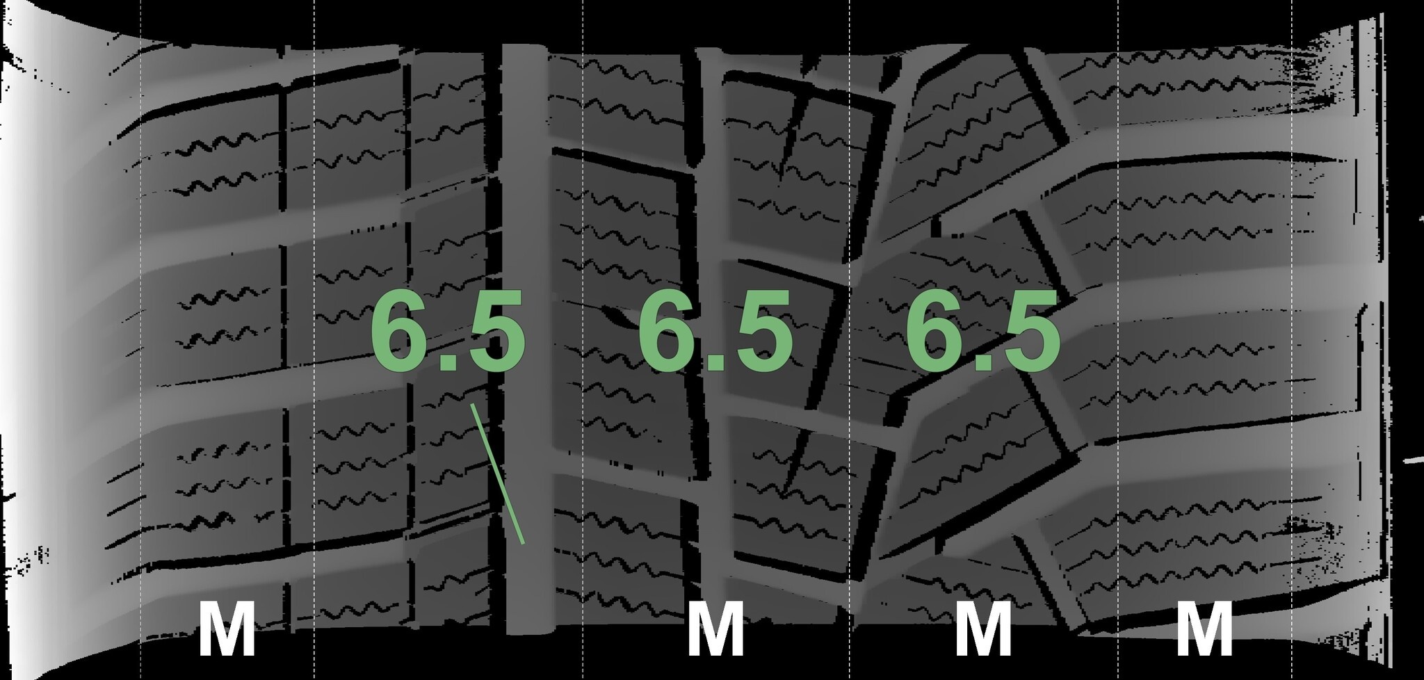 Zustand | Profiltiefe | DOT | Vorderachse Links | Gebraucht | 6,5 mm | 3218 |