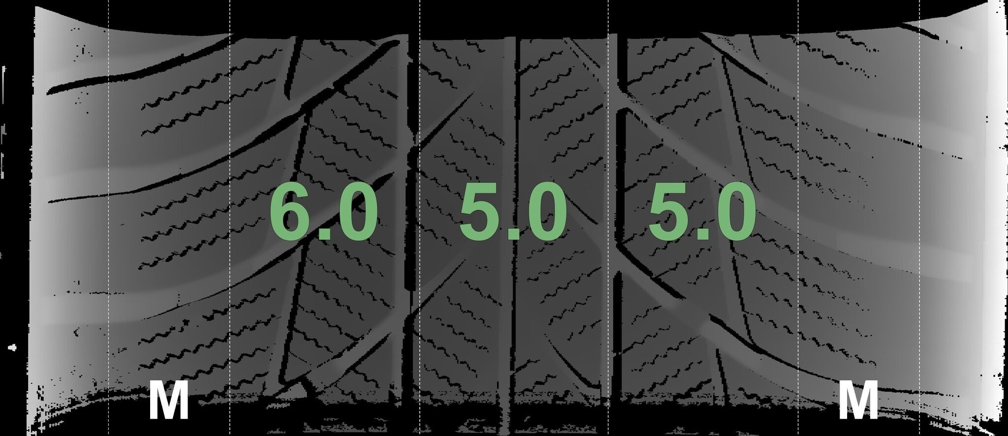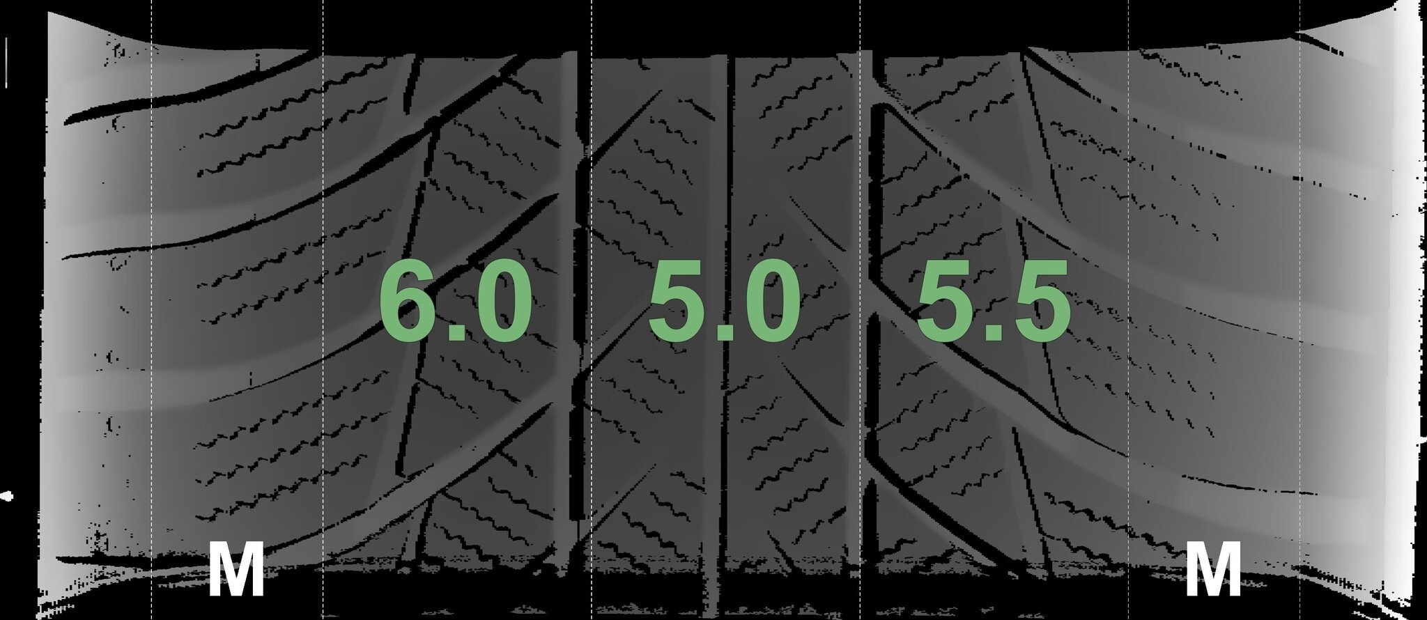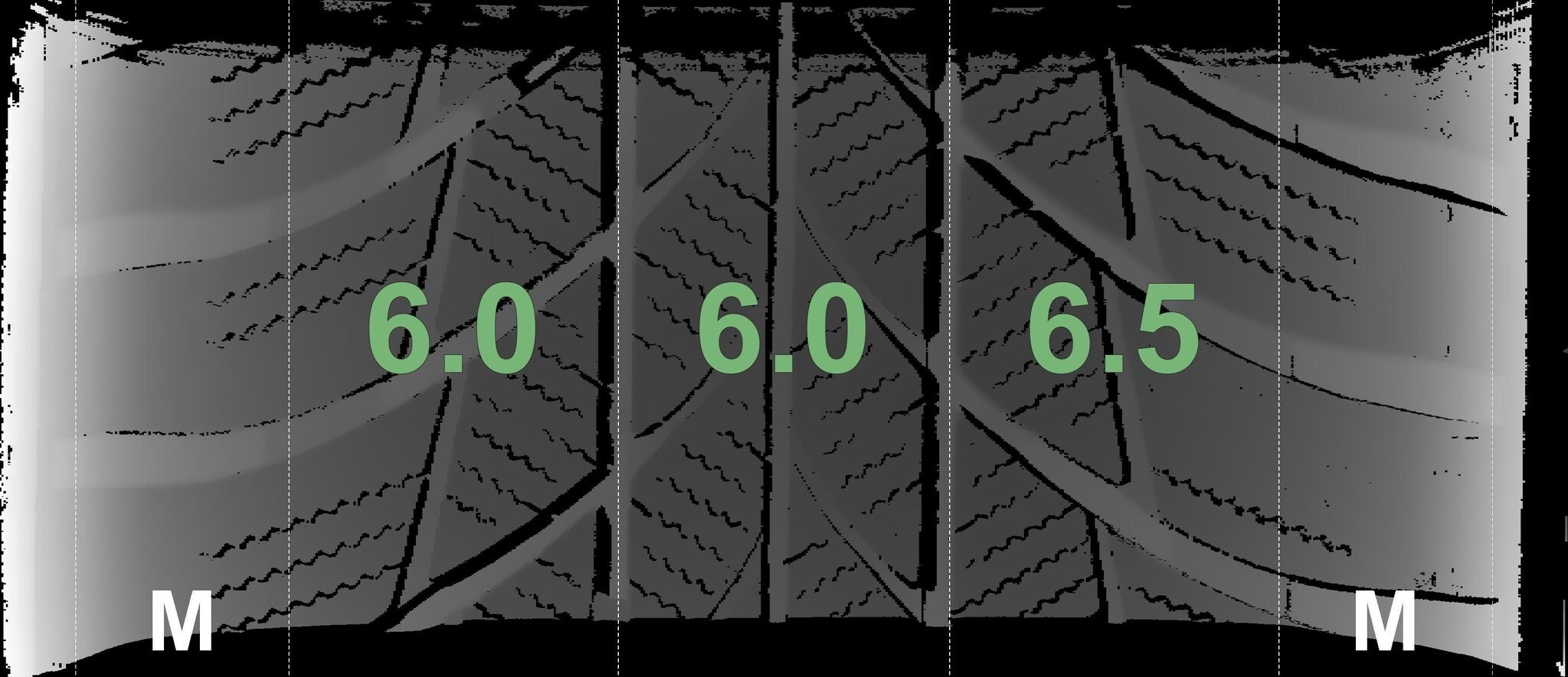 | Zustand | Profiltiefe | DOT | Vorderachse Links | Gebraucht | 6,2 mm | 4019 |