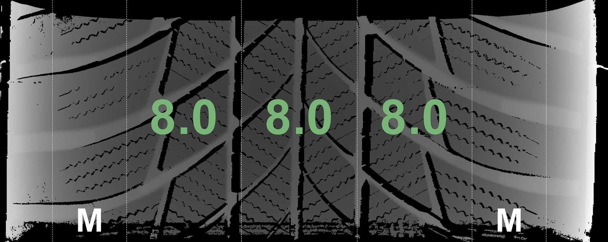 | Zustand | Profiltiefe | DOT | Hinterachse Links | Neu | 8.0 mm | 4721 |
