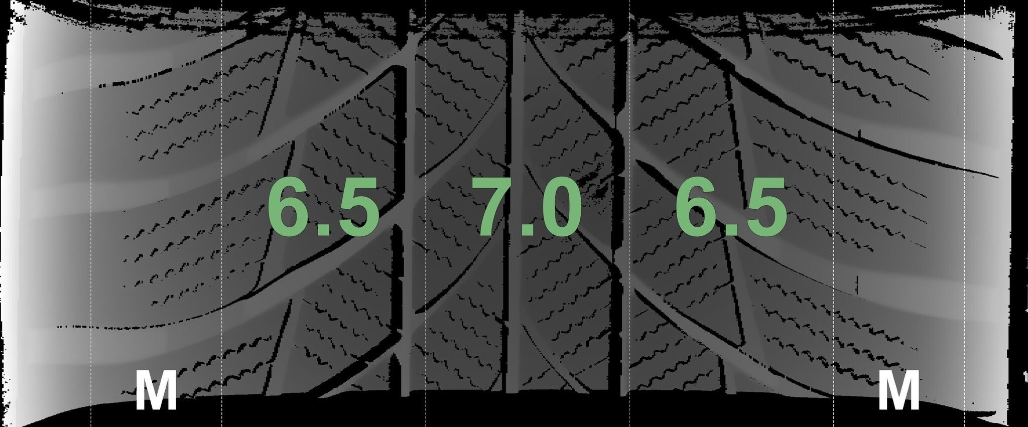 Die gemessenen Profiltiefen und die Details der Felgen sind oben dargestellt.