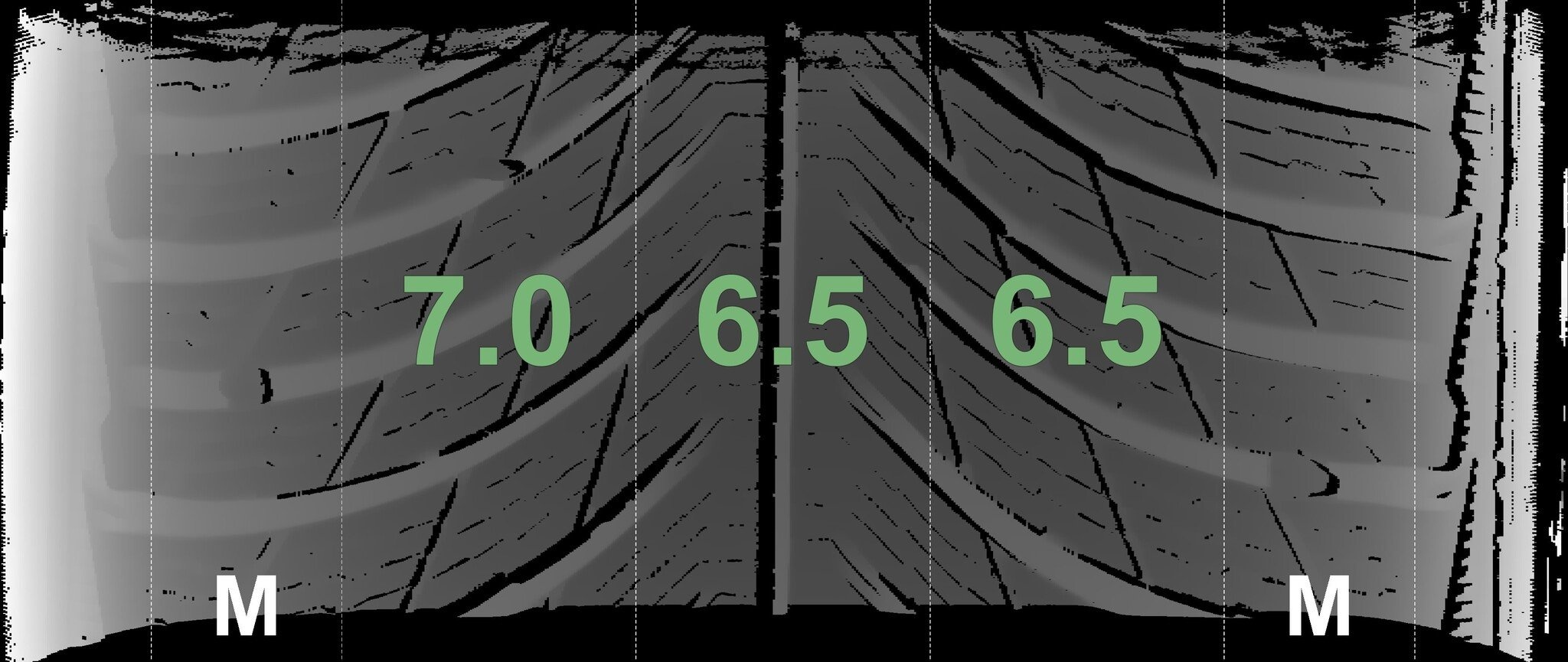 Die gemessenen Profiltiefen und die Details der Felgen sind oben dargestellt.