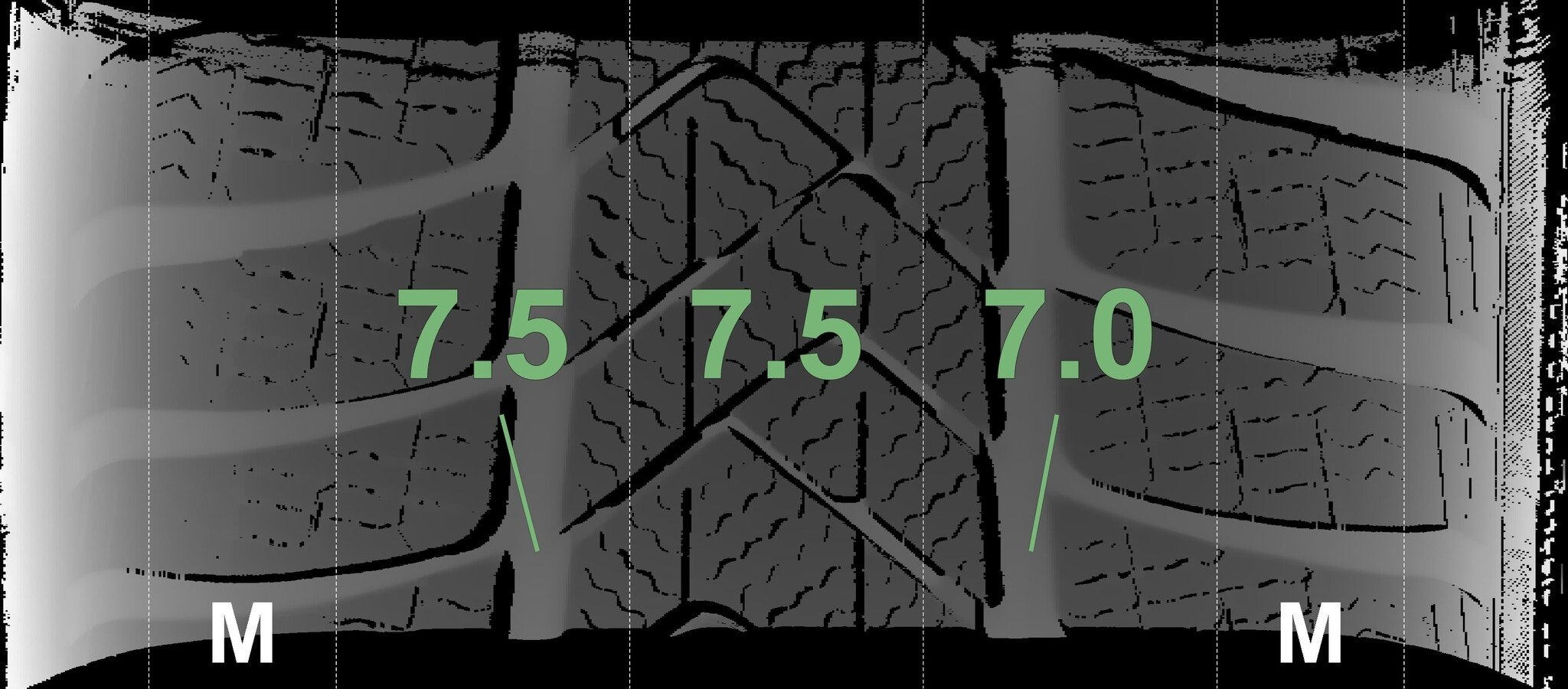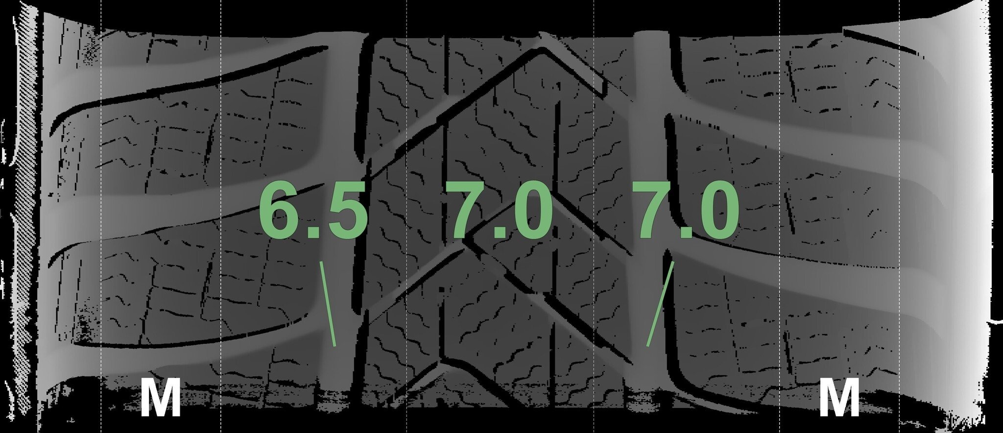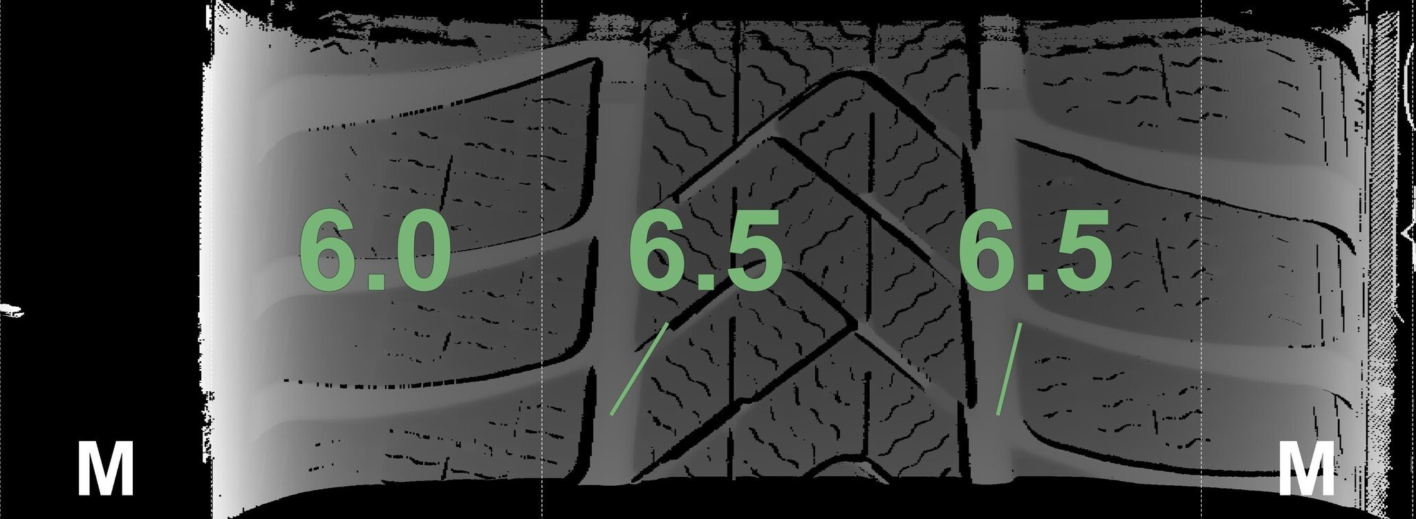 Die gemessenen Profiltiefen und die Details der Felgen sind oben dargestellt.