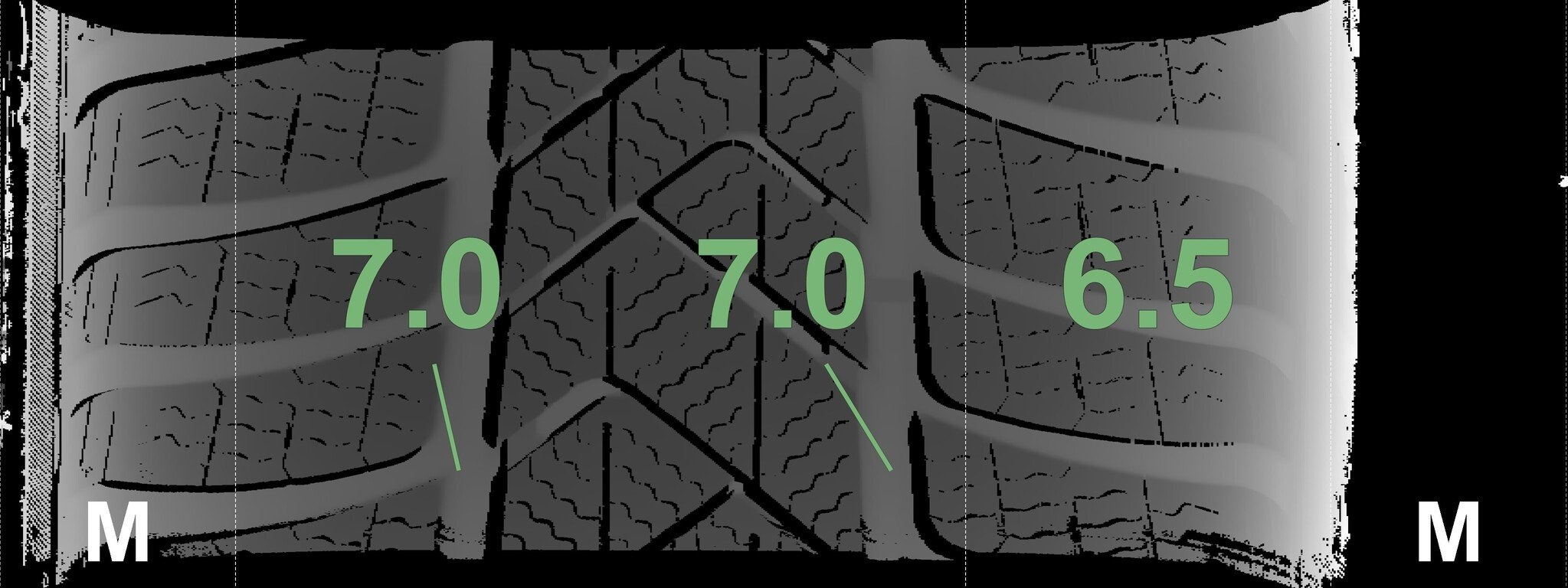 Die gemessenen Profiltiefen und die Details der Felgen sind oben dargestellt.