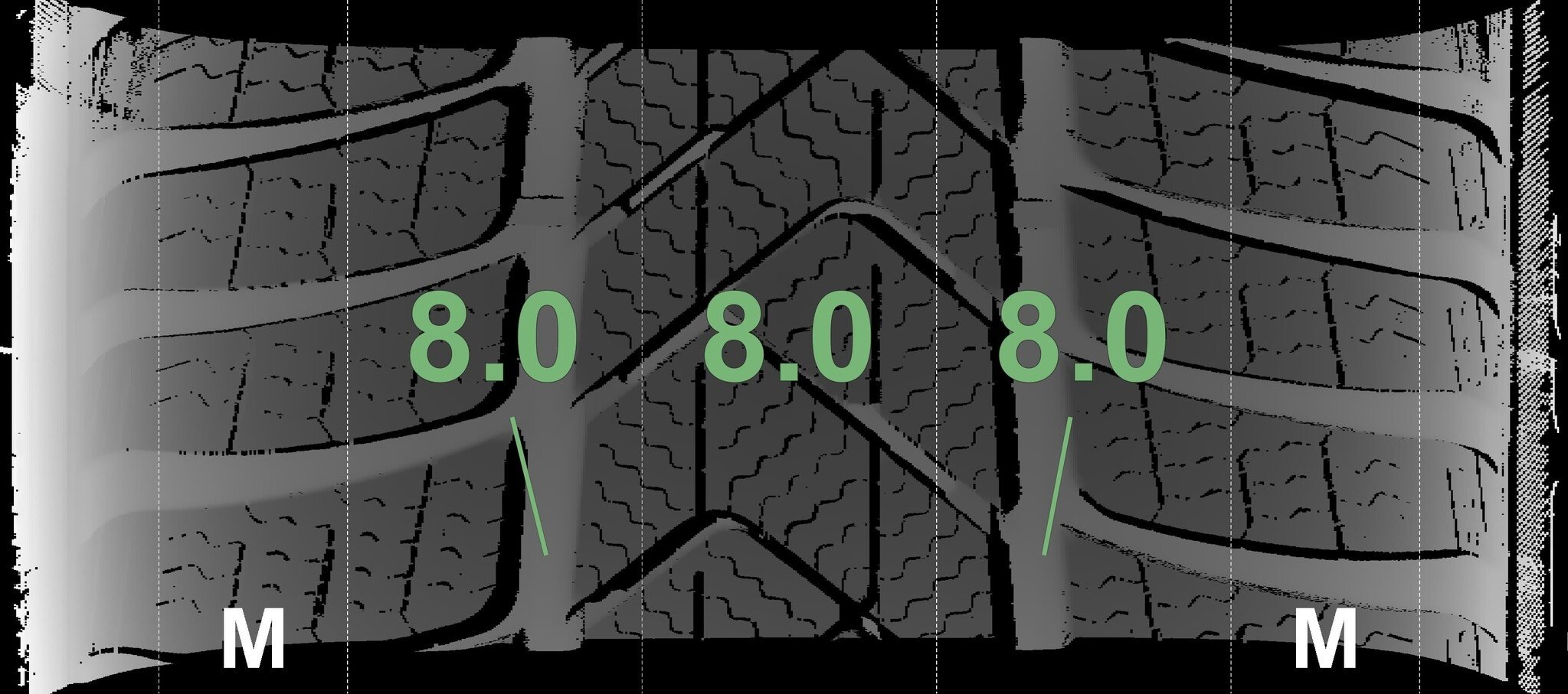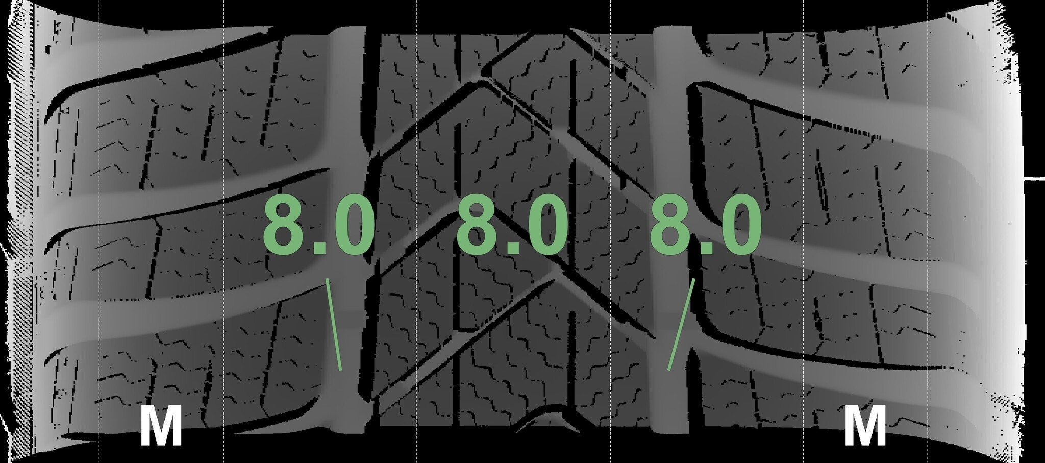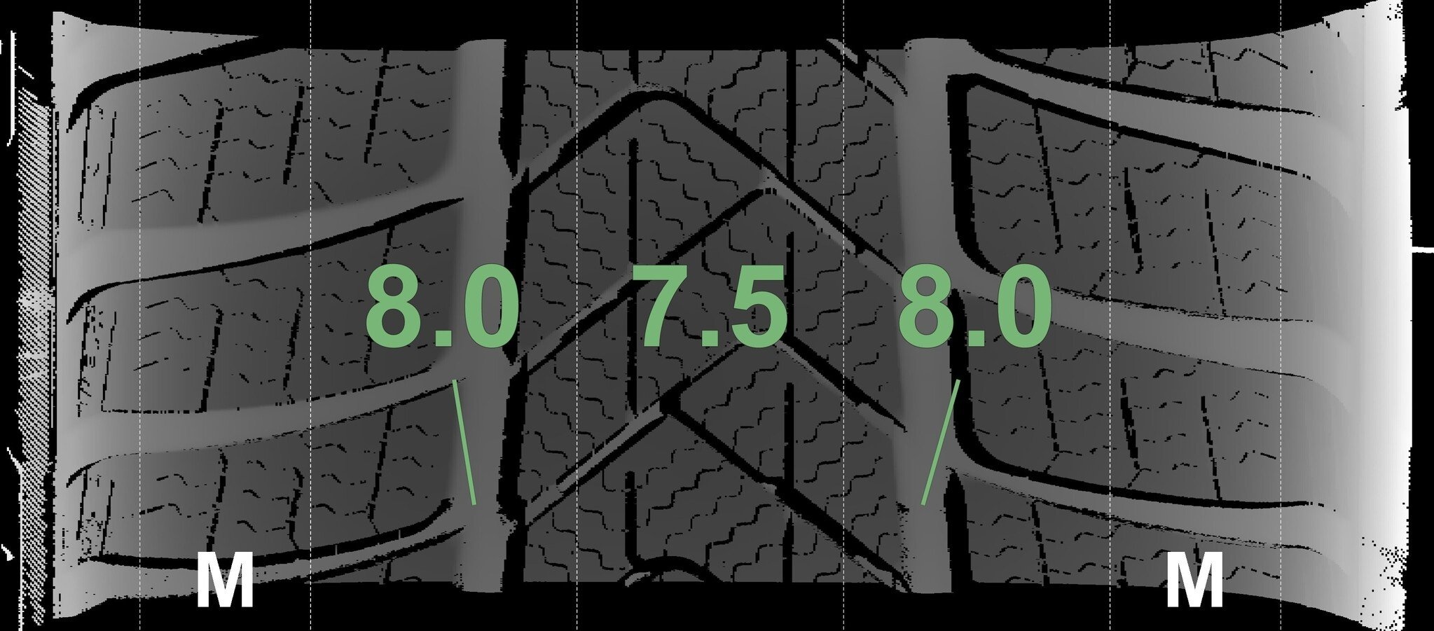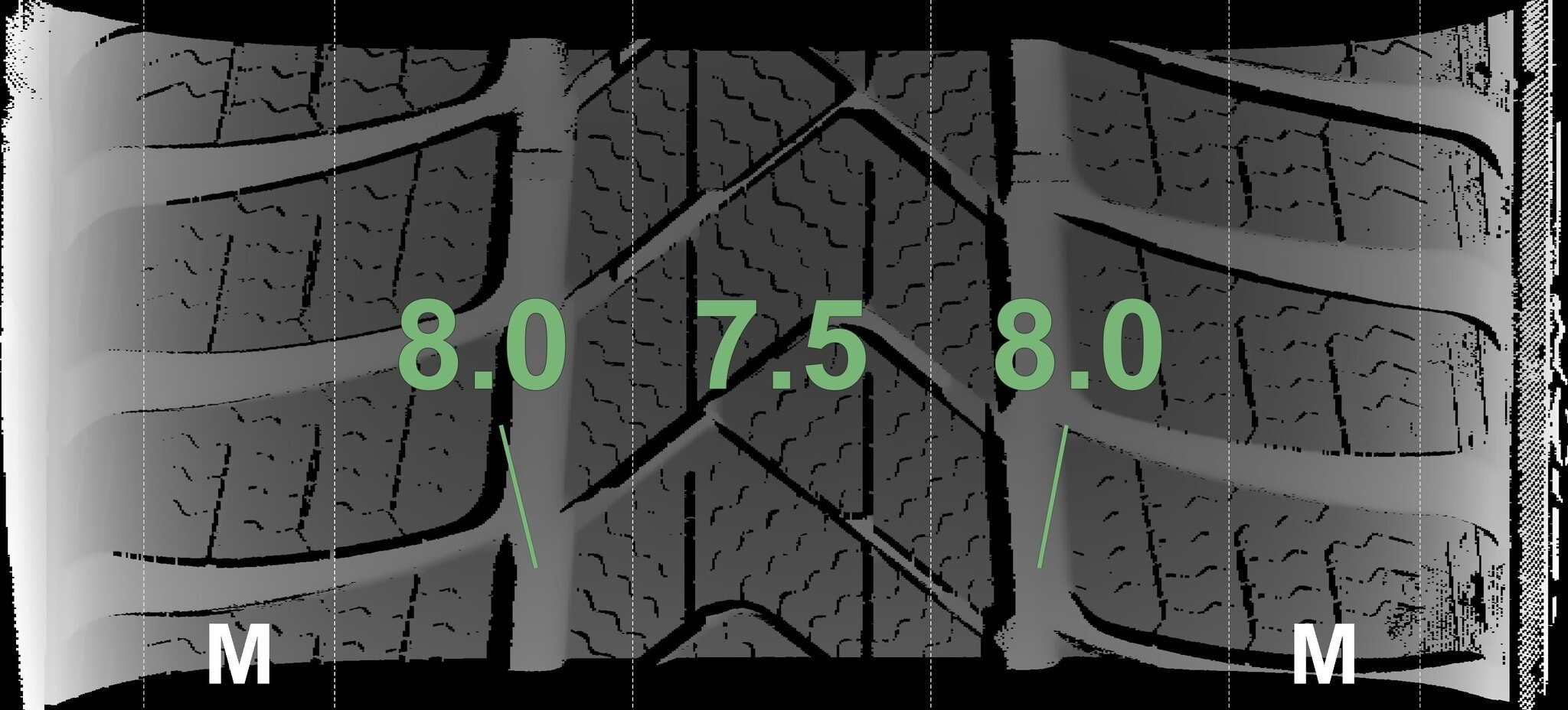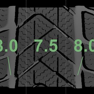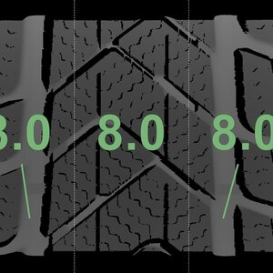 | Zustand | Profiltiefe | DOT | Vorderachse Links | Neu | 8,0 mm | 2625 |