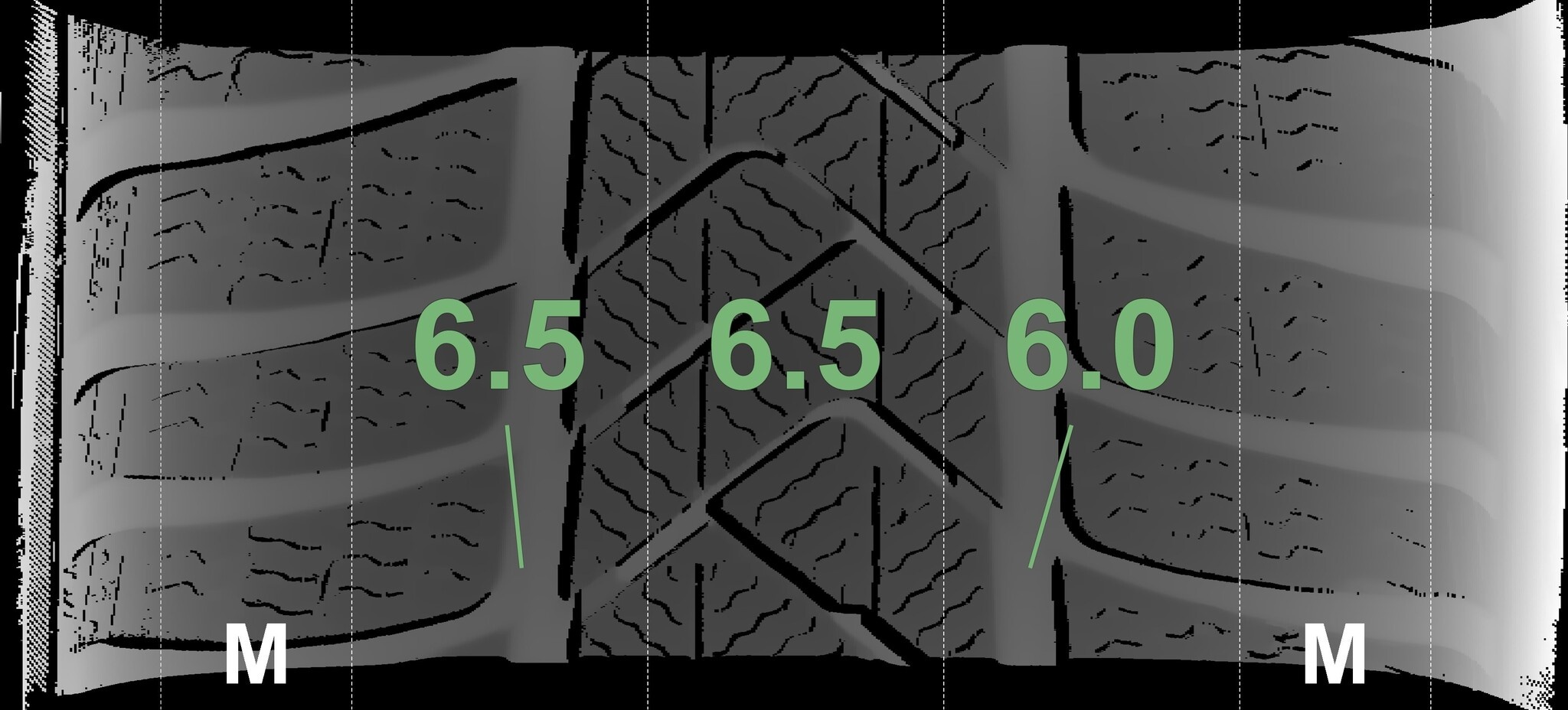 Die gemessenen Profiltiefen und die Details der Felgen sind oben dargestellt.