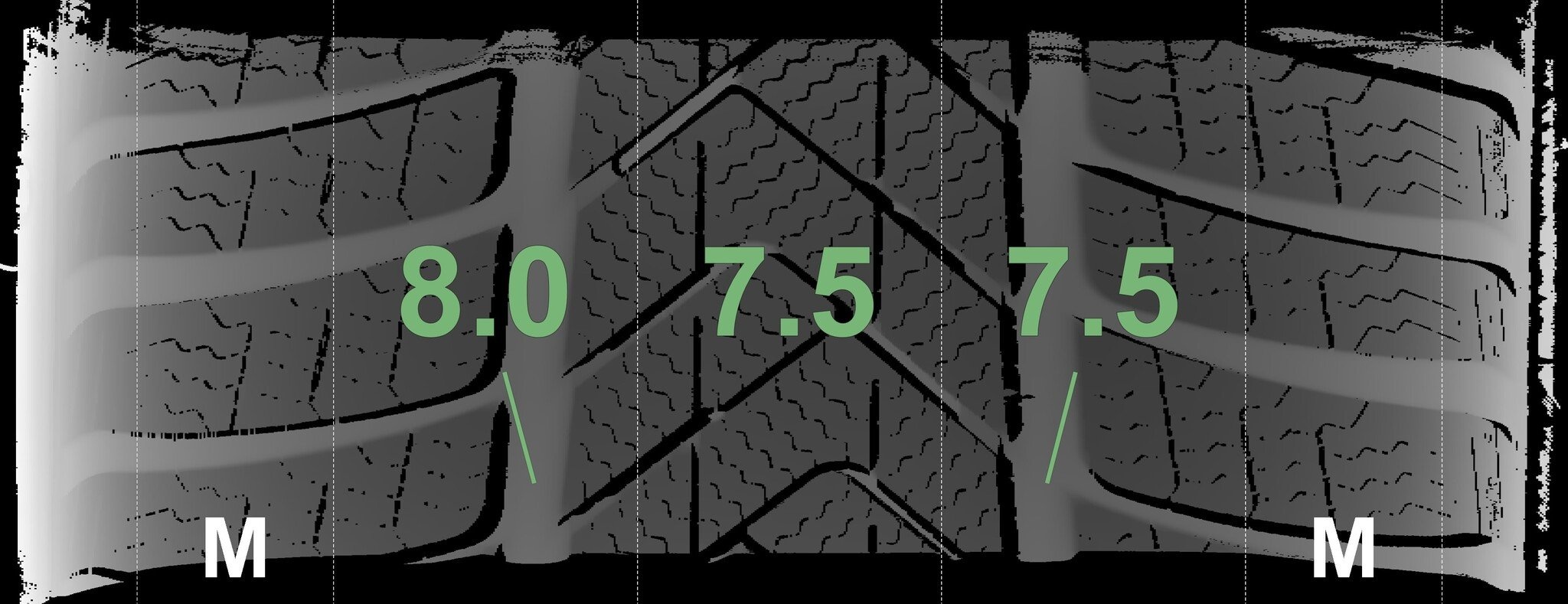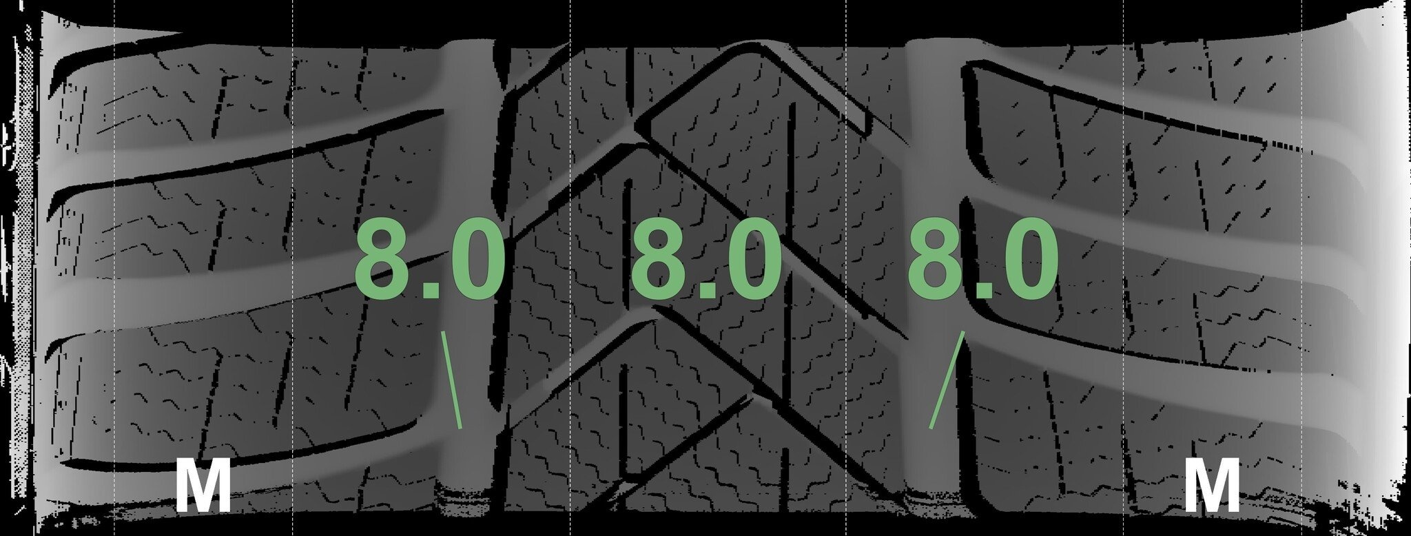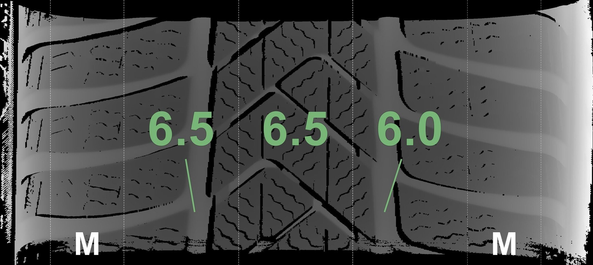| Zustand | Profiltiefe | DOT | Hinterachse Rechts | Neu | 8.0 mm | 3125 |