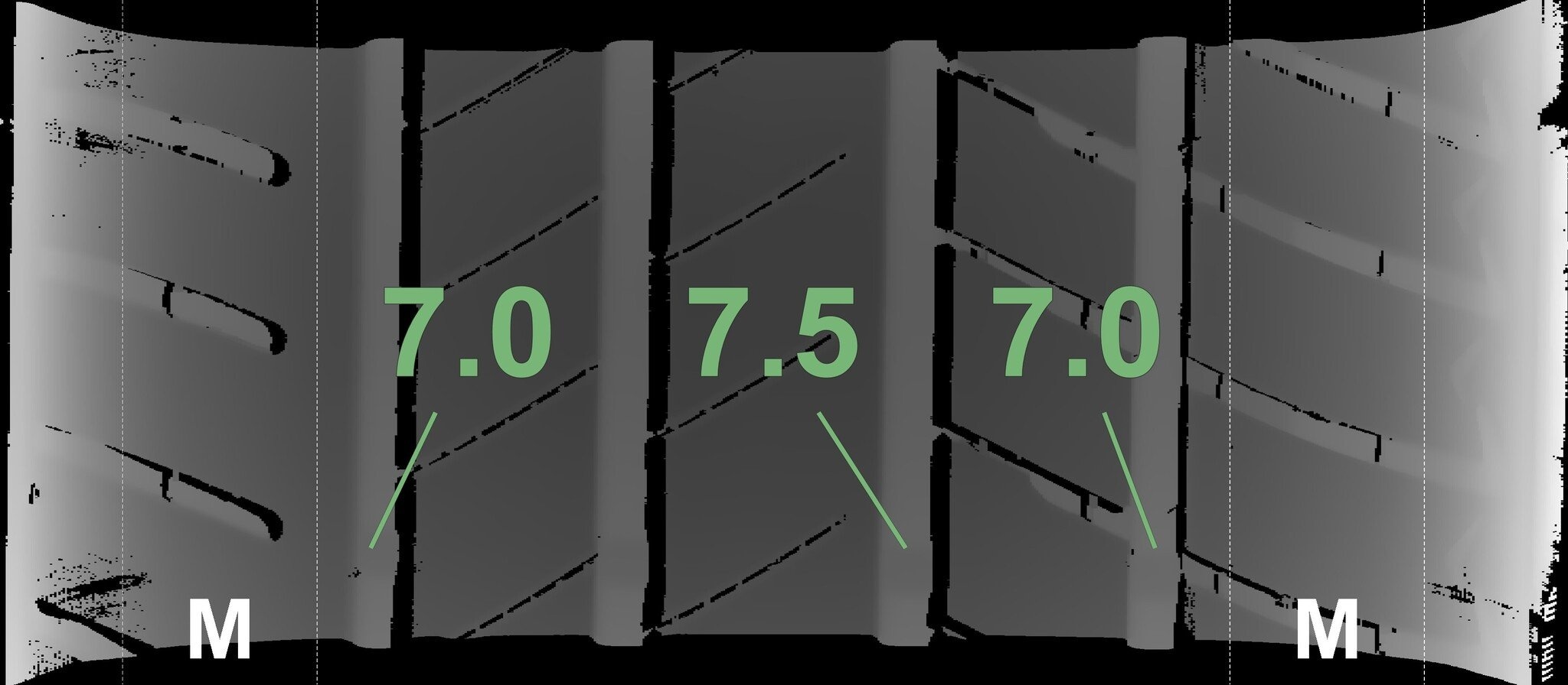 Zustand | Profiltiefe | DOT | Vorderachse Rechts | Demo-Noppen noch sichtbar | 7,0 mm | 4319 |