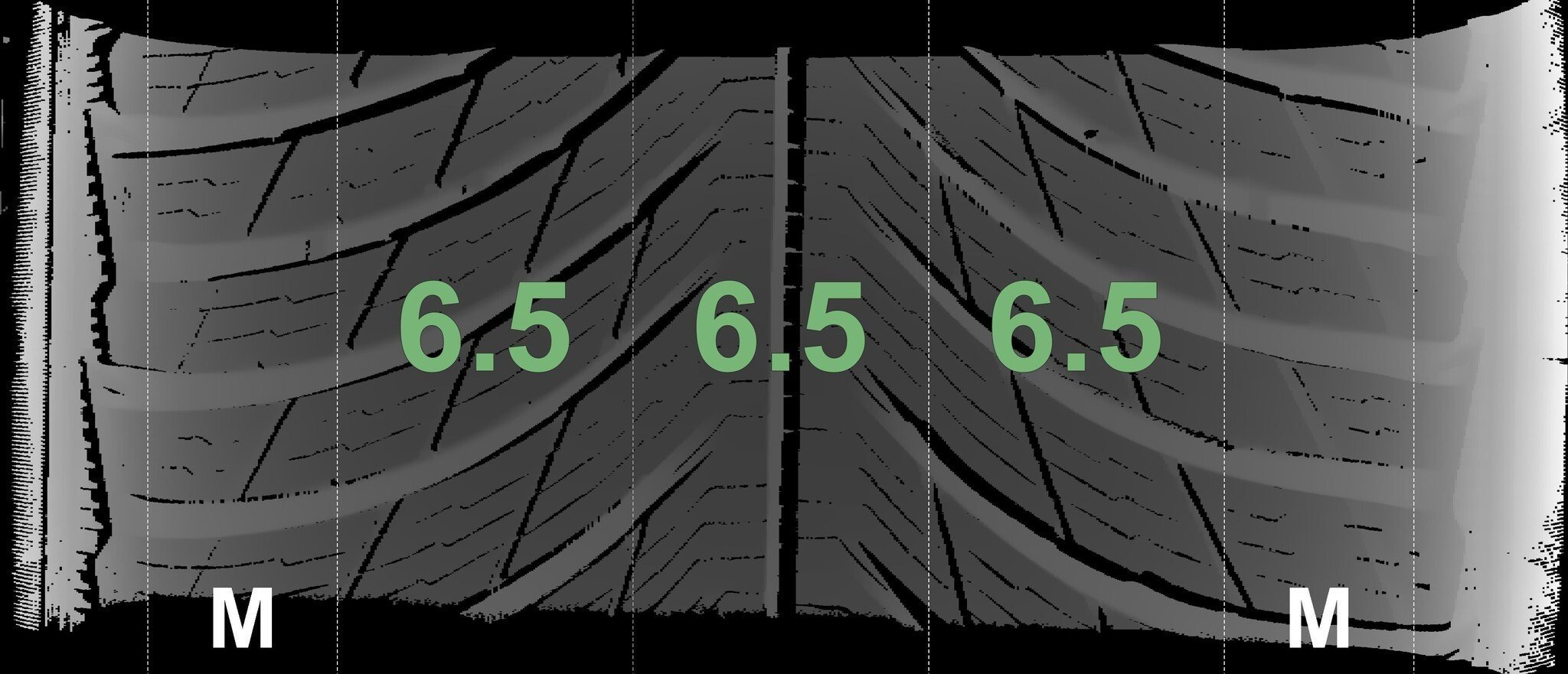 | Zustand | Profiltiefe | DOT | Vorderachse Links | Gebraucht | 6,5 mm | 4020 |