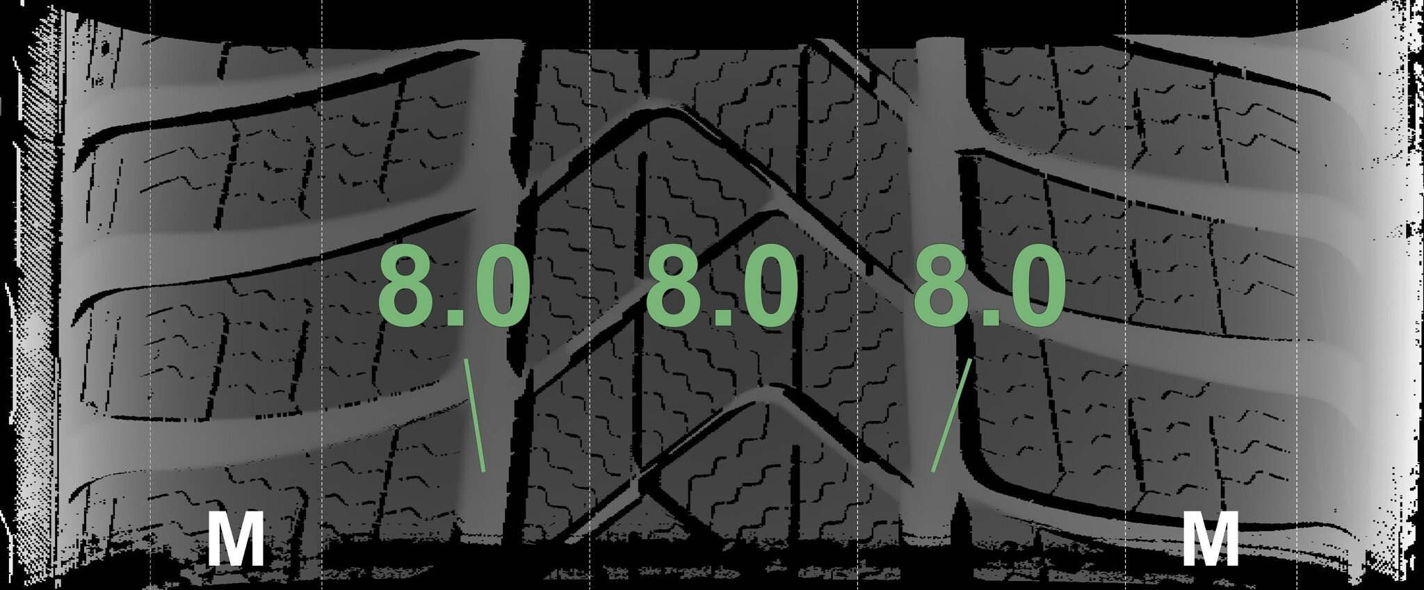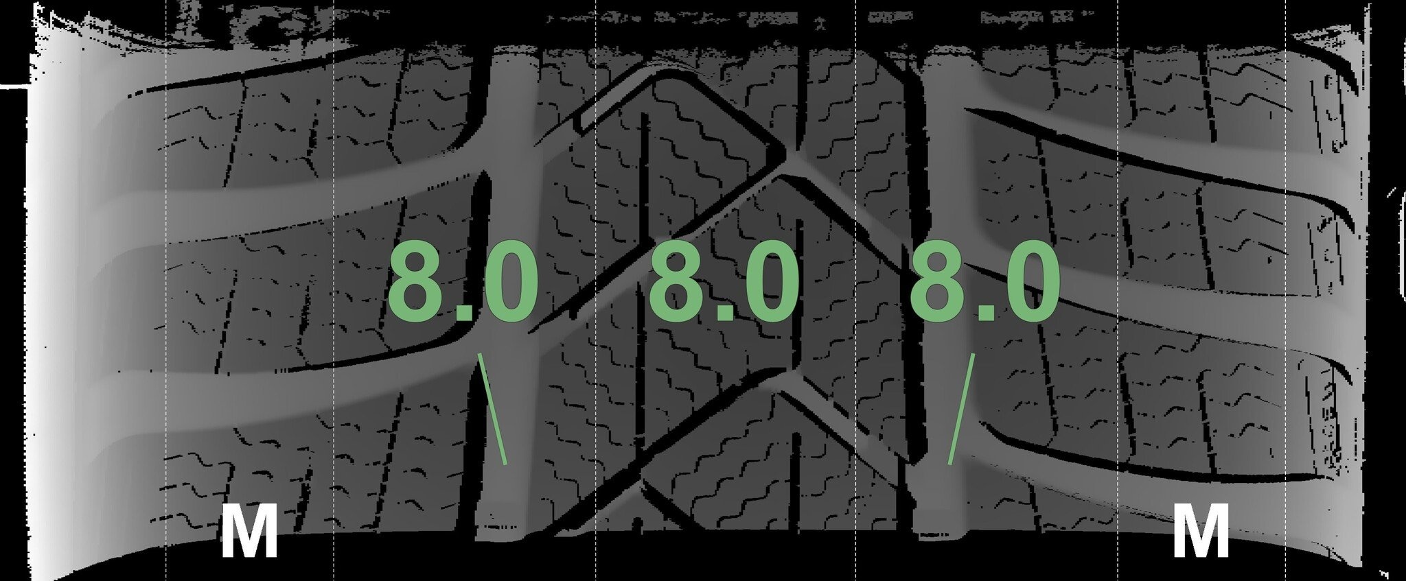 | Zustand | Profiltiefe | DOT | Hinterachse Links | Neu | 8,0 mm | 4525 |