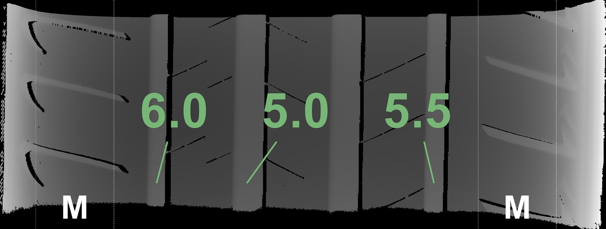 Die gemessenen Profiltiefen und die Details der Felgen sind oben dargestellt.