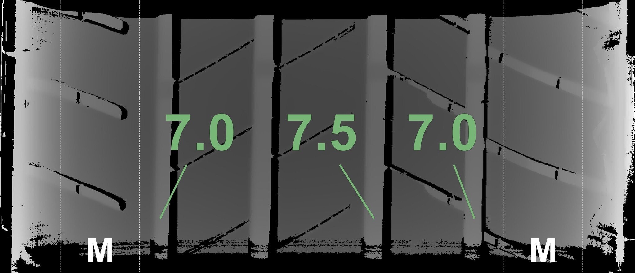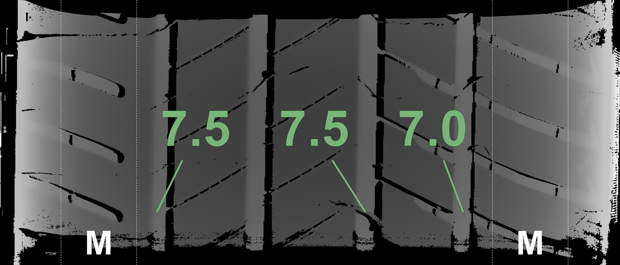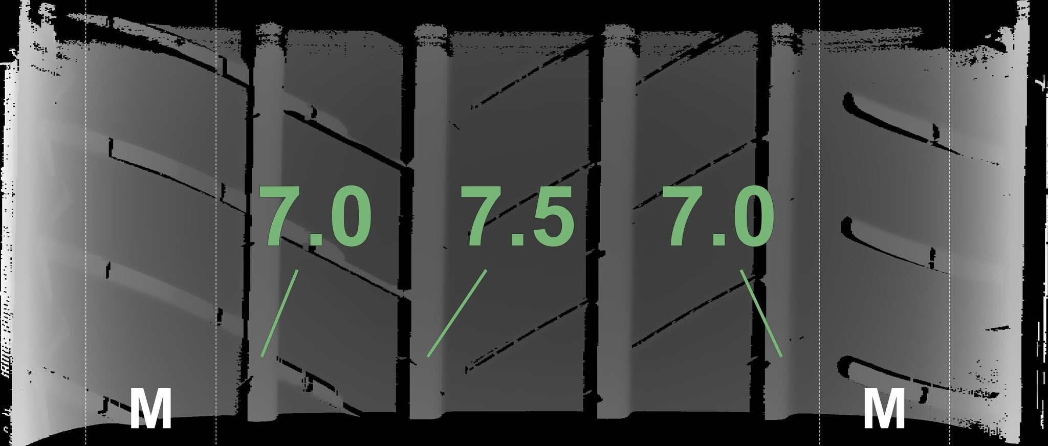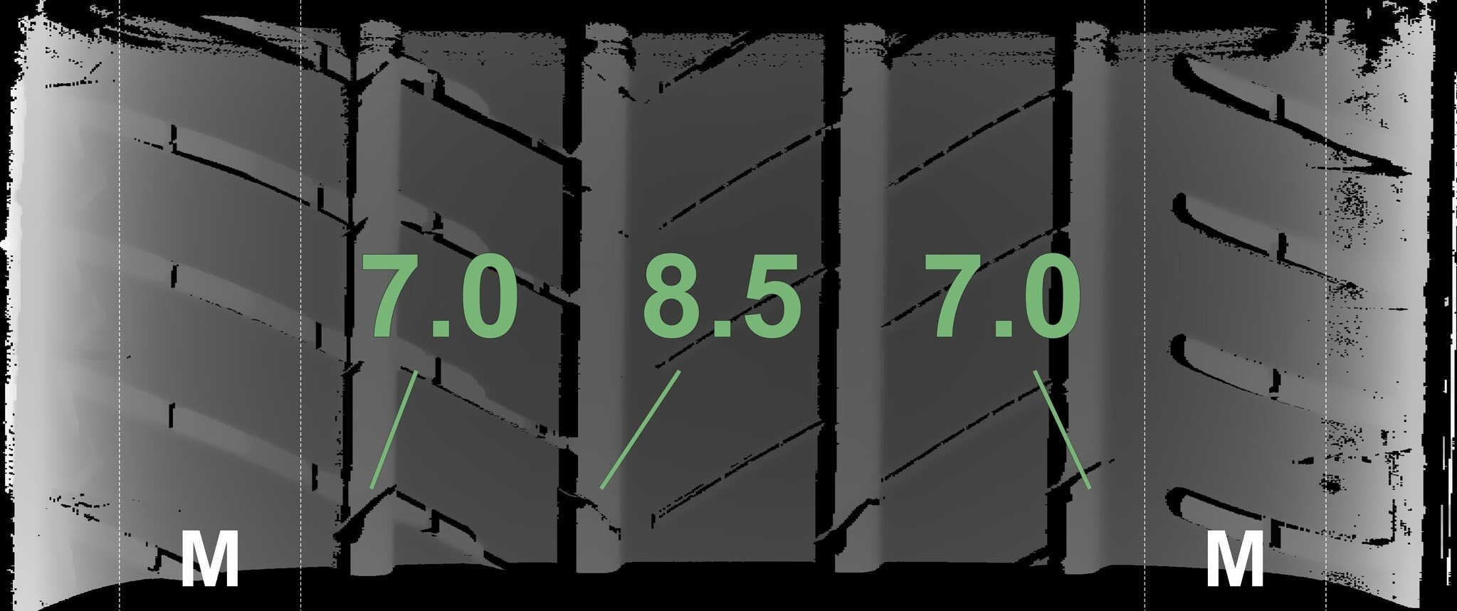 Die gemessenen Profiltiefen und die Details der Felgen sind oben angezeigt.