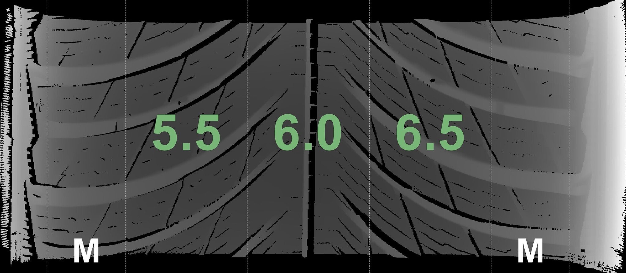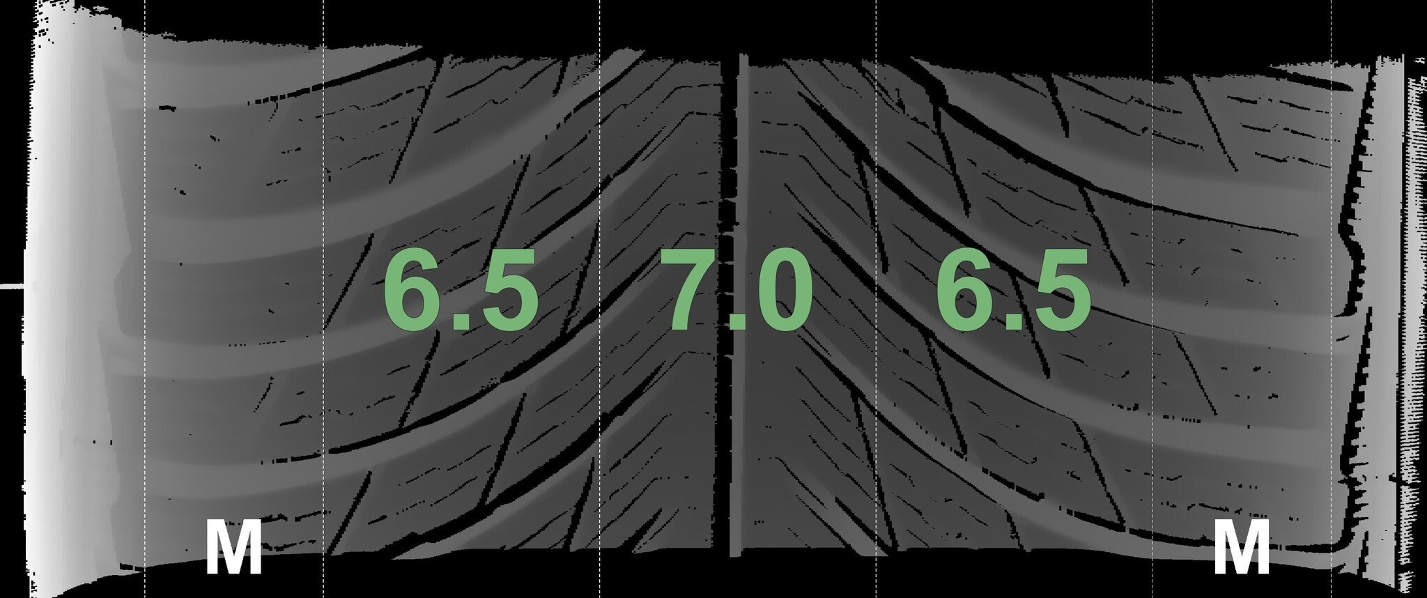 Die gemessenen Profiltiefen und die Details der Felgen sind oben dargestellt.