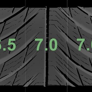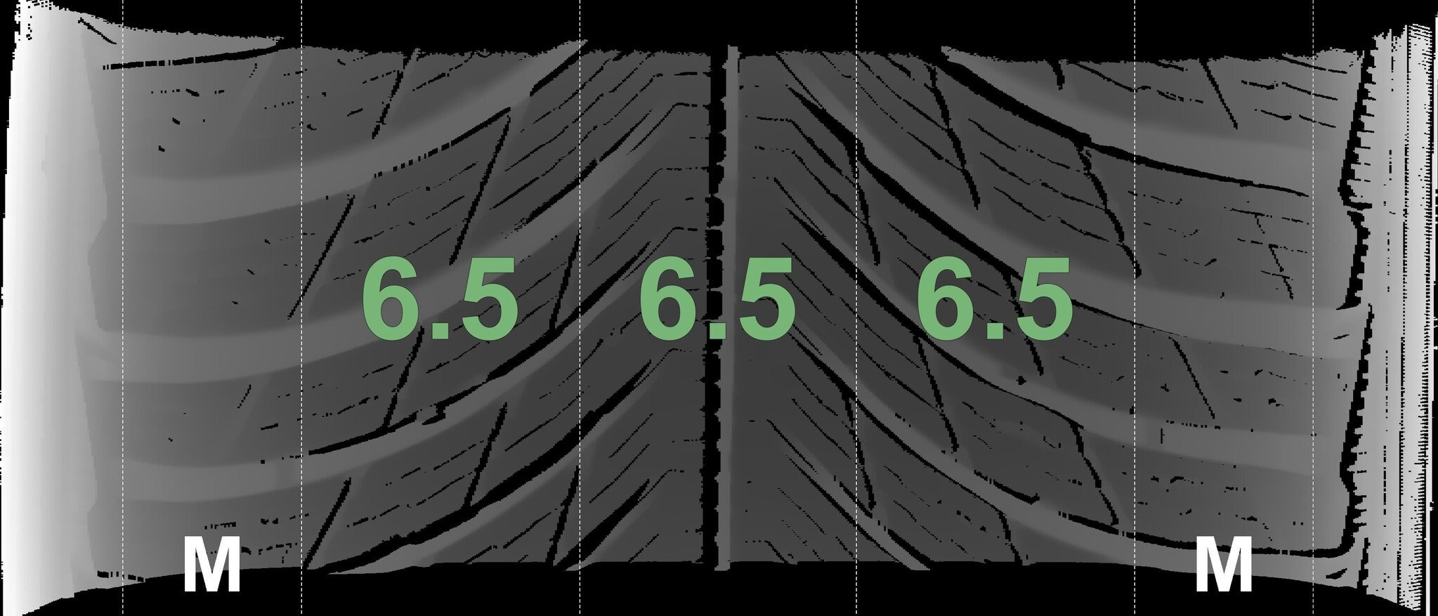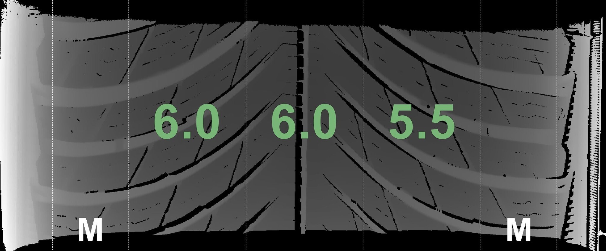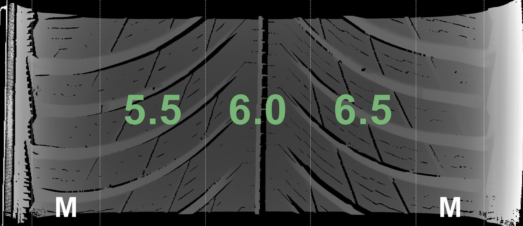 Die gemessenen Profiltiefen und die Details der Felgen sind oben dargestellt.