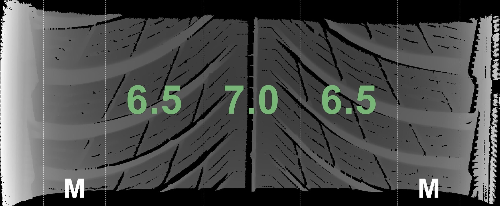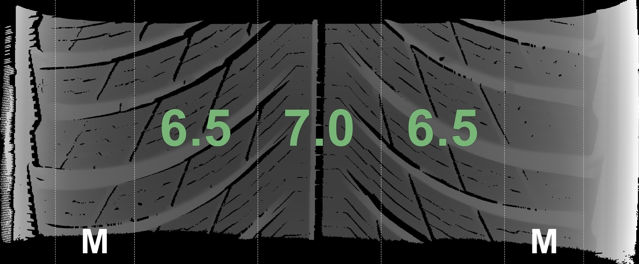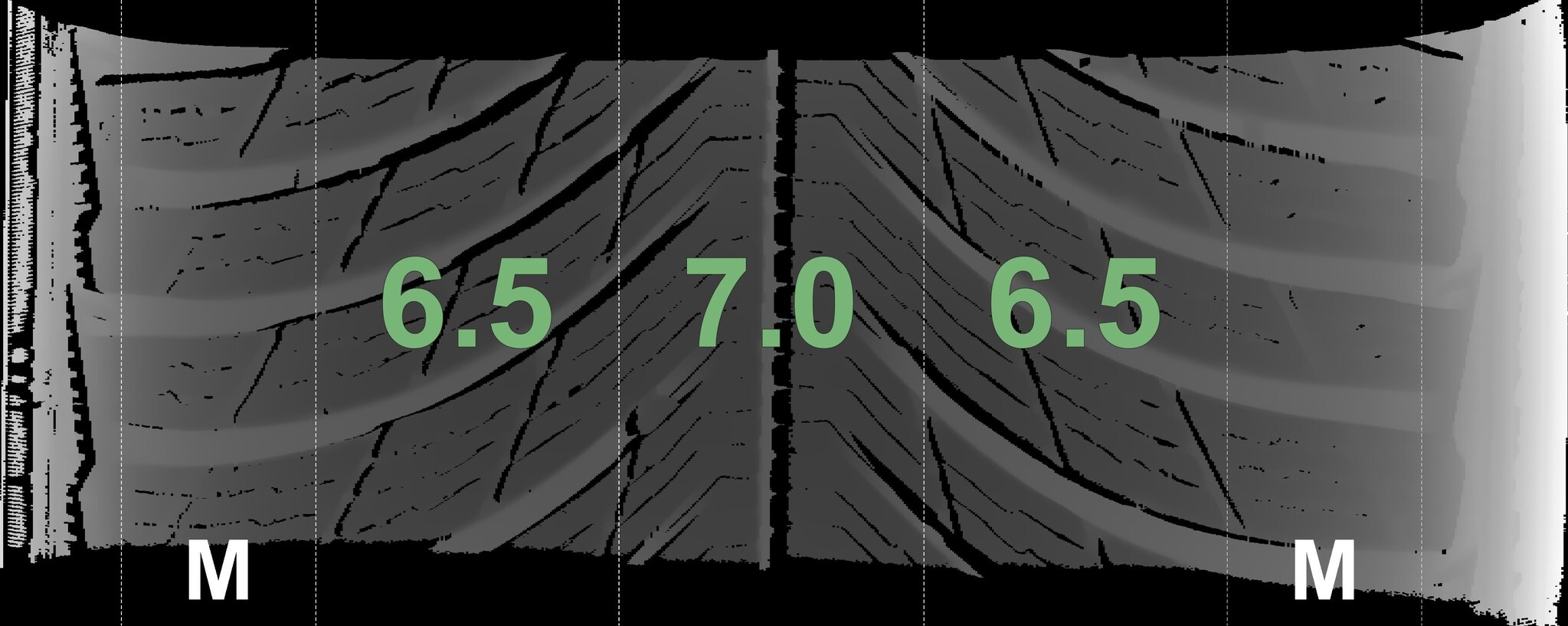 Die gemessenen Profiltiefen und die Details der Felgen sind oben aufgeführt.