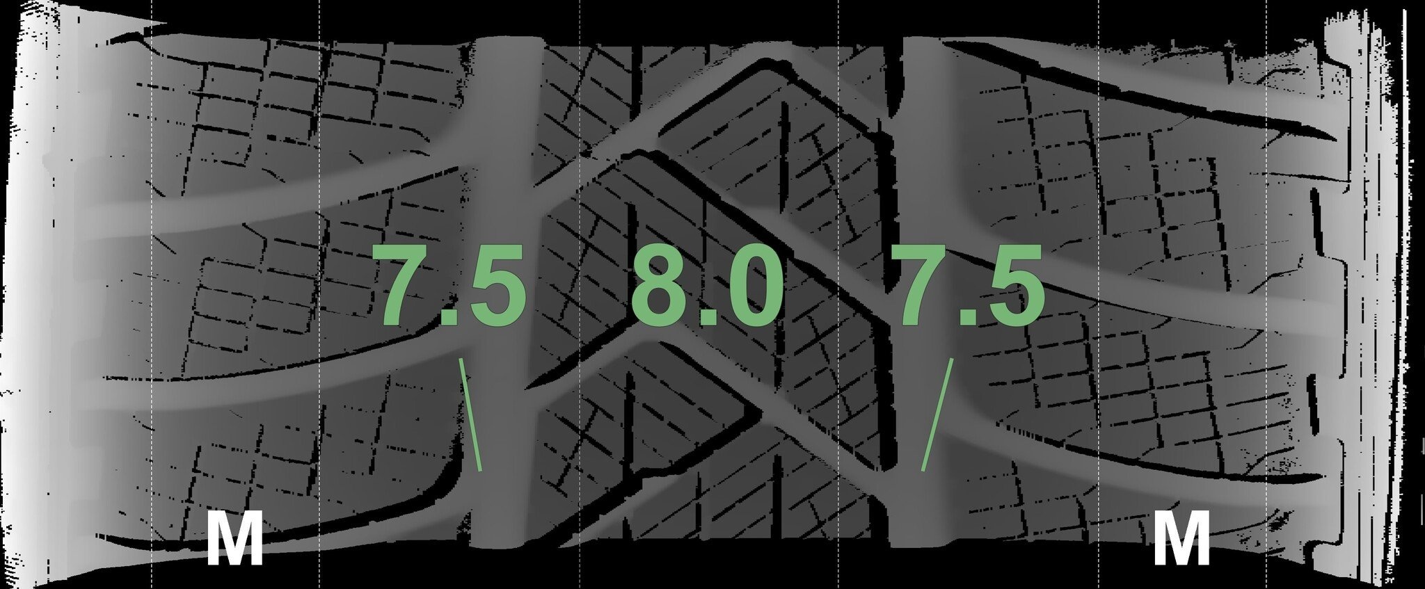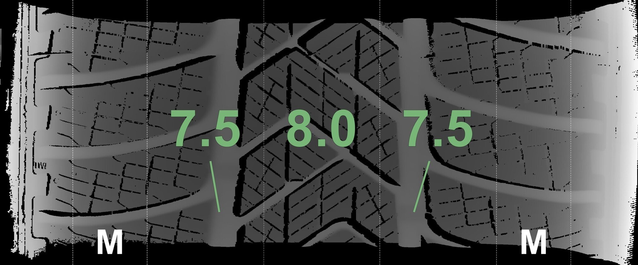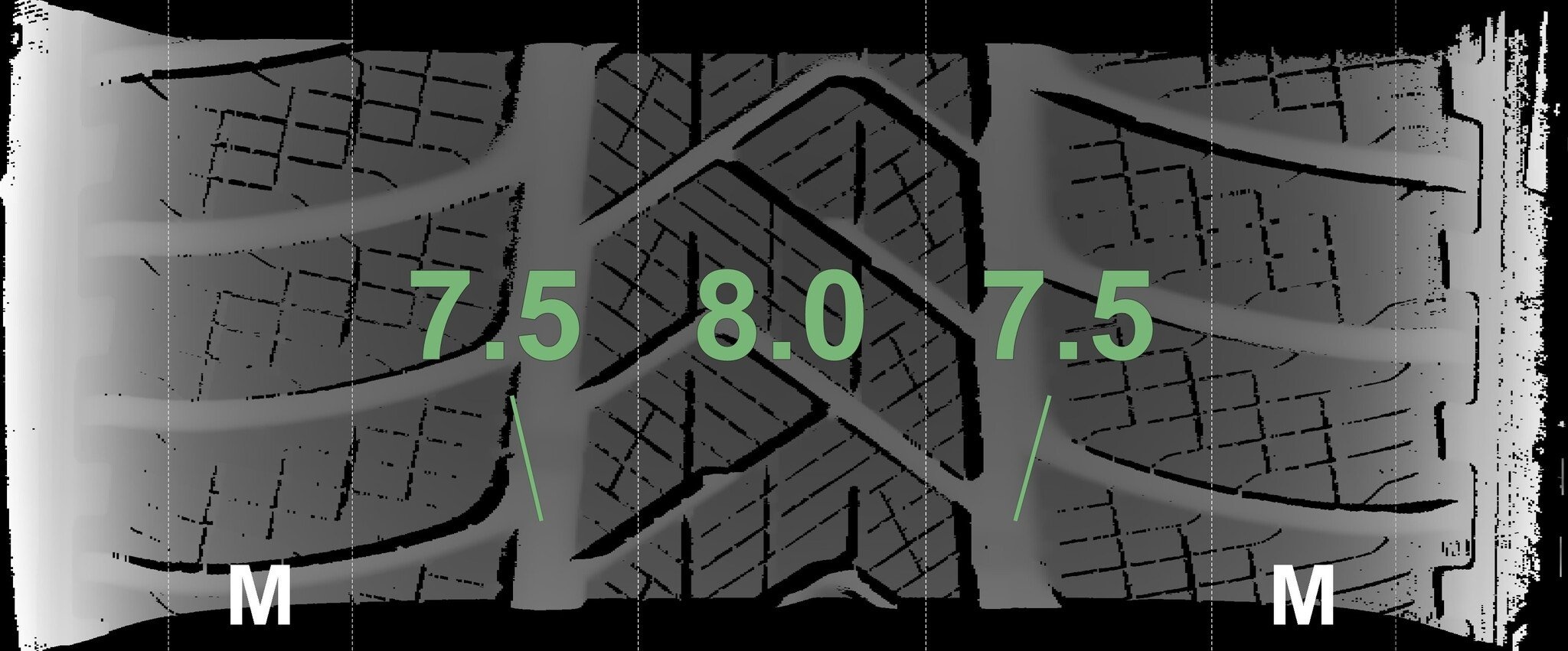 | Zustand | Profiltiefe | DOT | Vorderachse Rechts | Demo-Noppen noch sichtbar | 7,5 mm | 3622 |