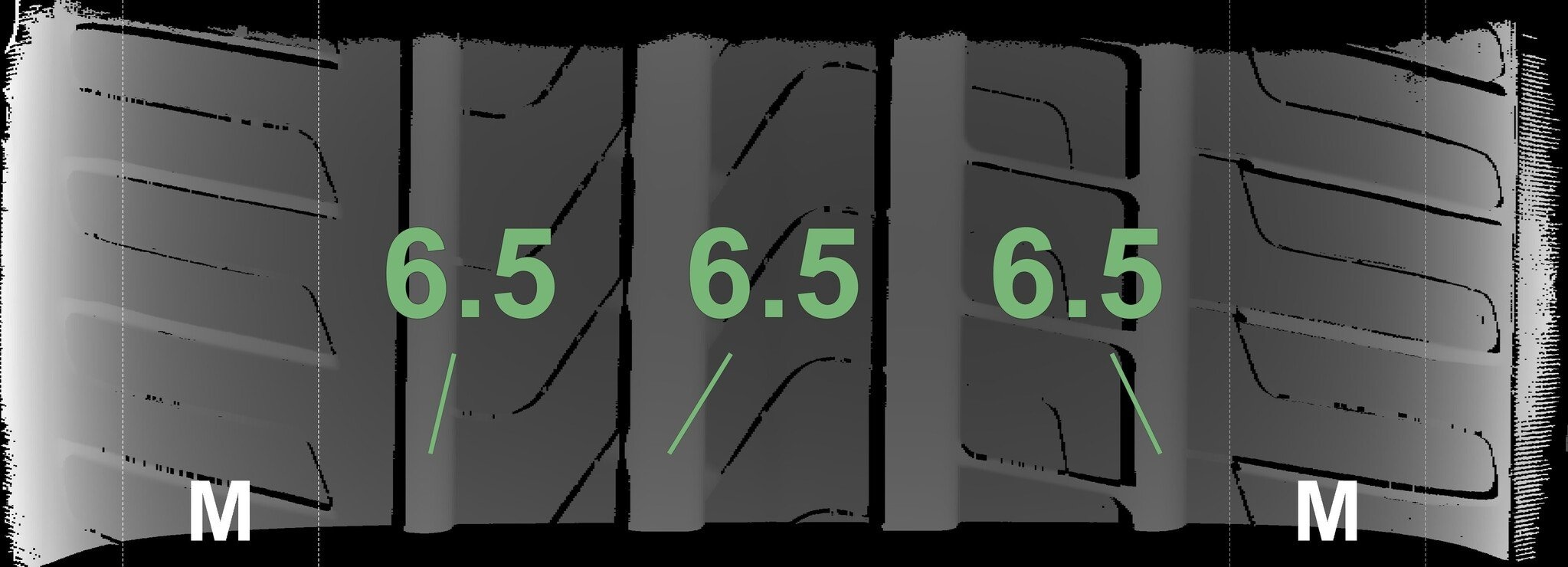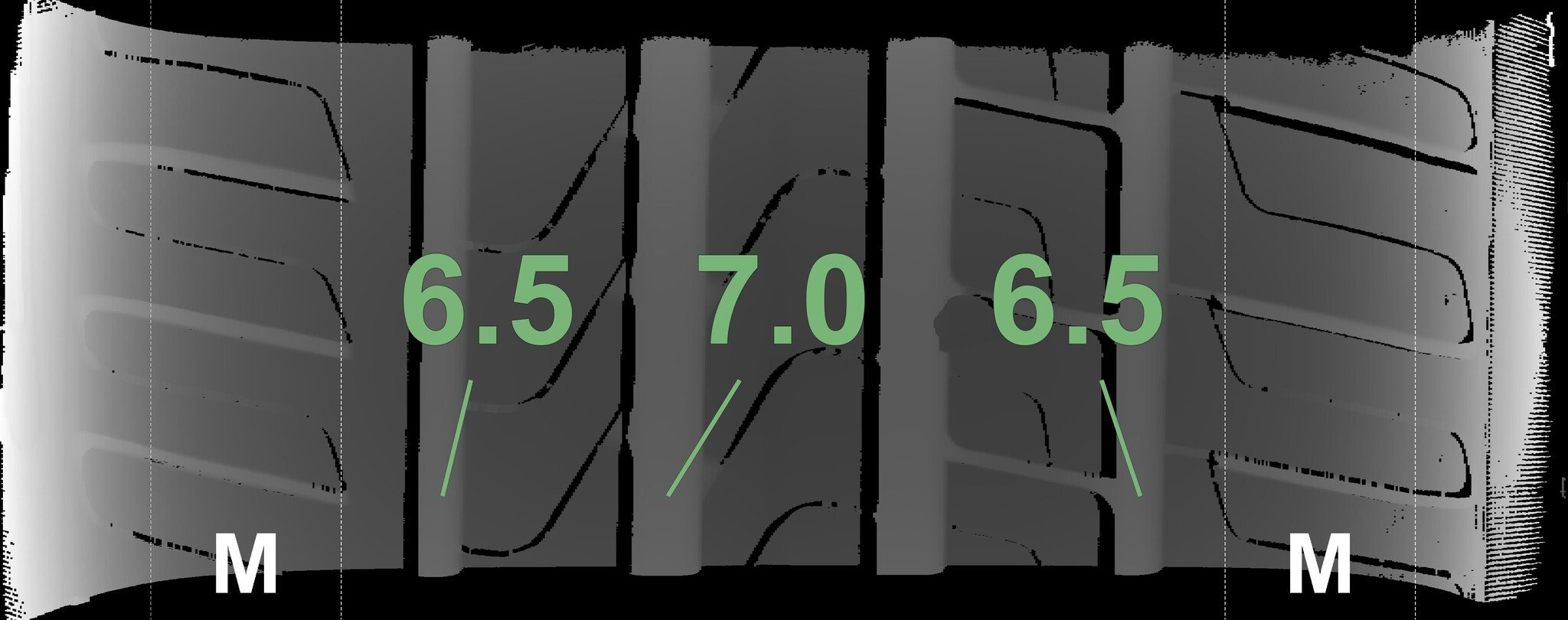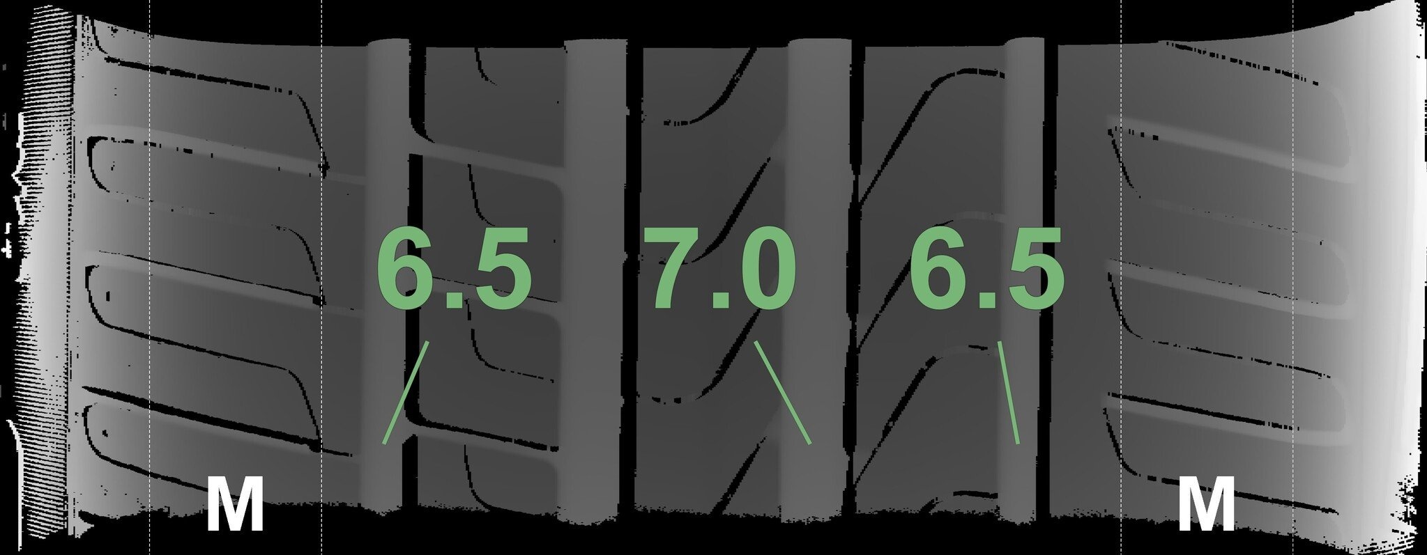Die gemessenen Profiltiefen und die Details der Felgen sind oben dargestellt.