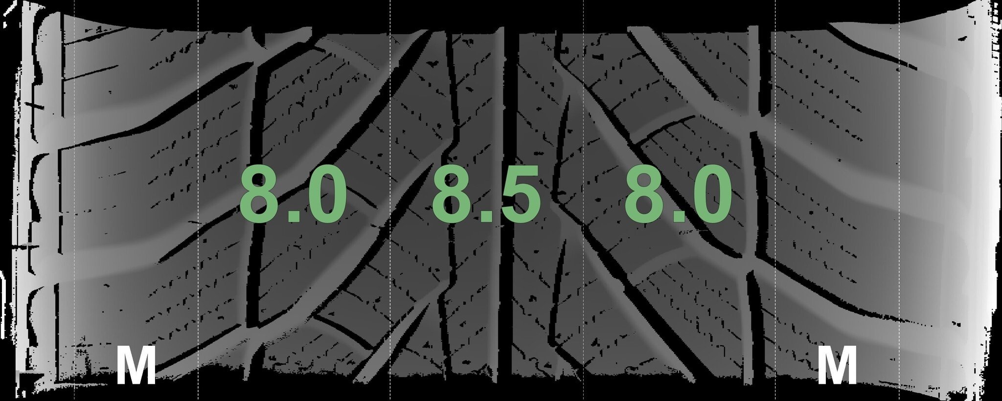 Die gemessenen Profiltiefen und die Details der Felgen sind oben dargestellt.