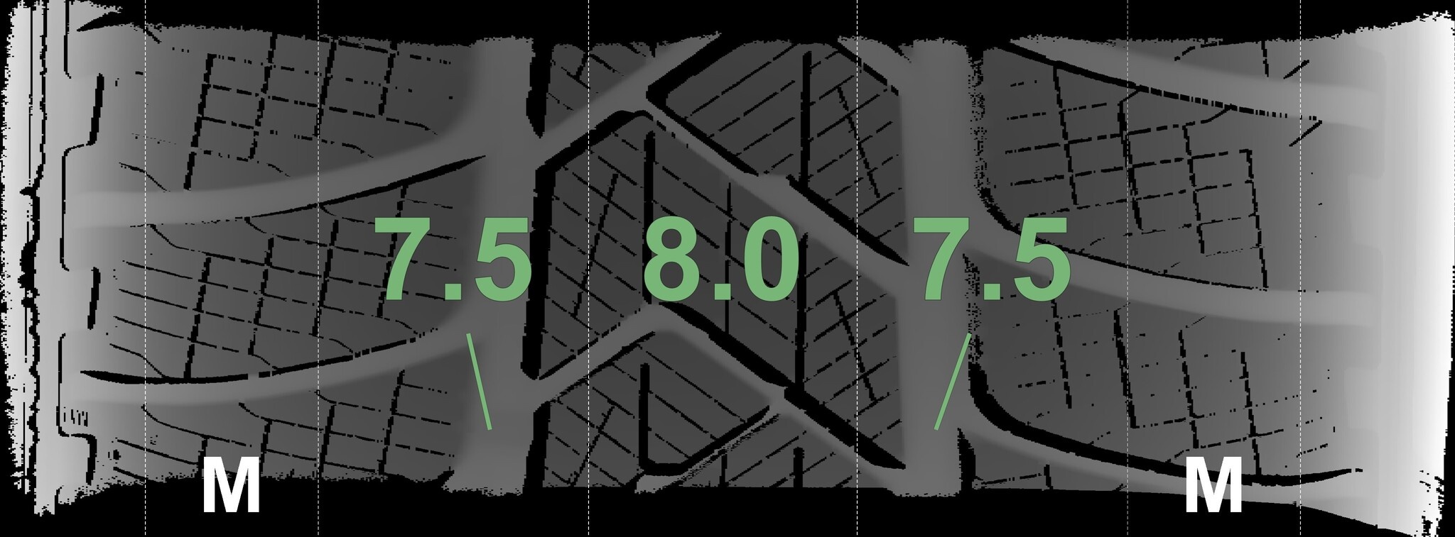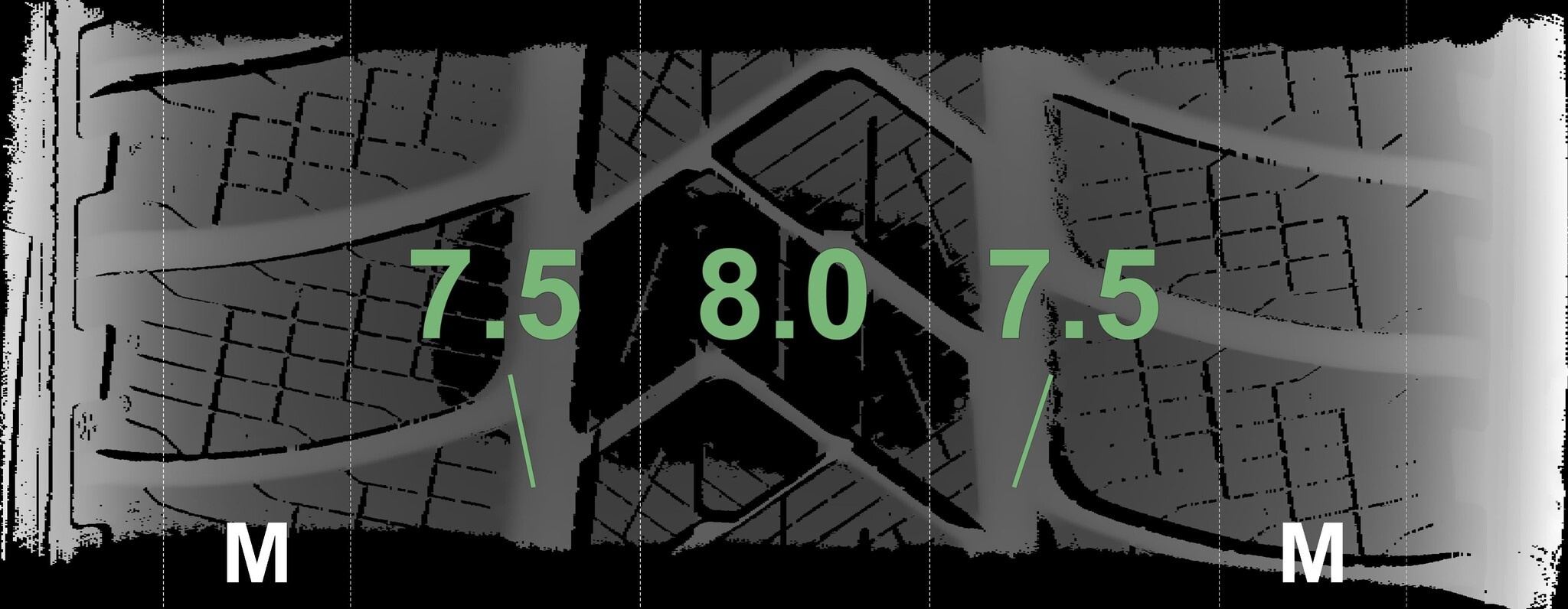 Die gemessenen Profiltiefen und die Details der Felgen sind oben dargestellt.