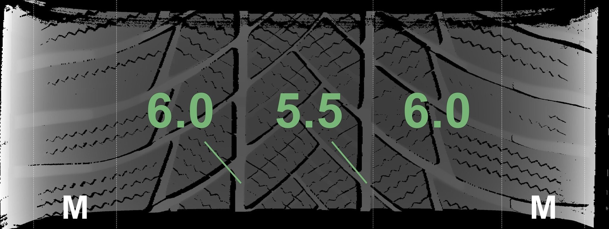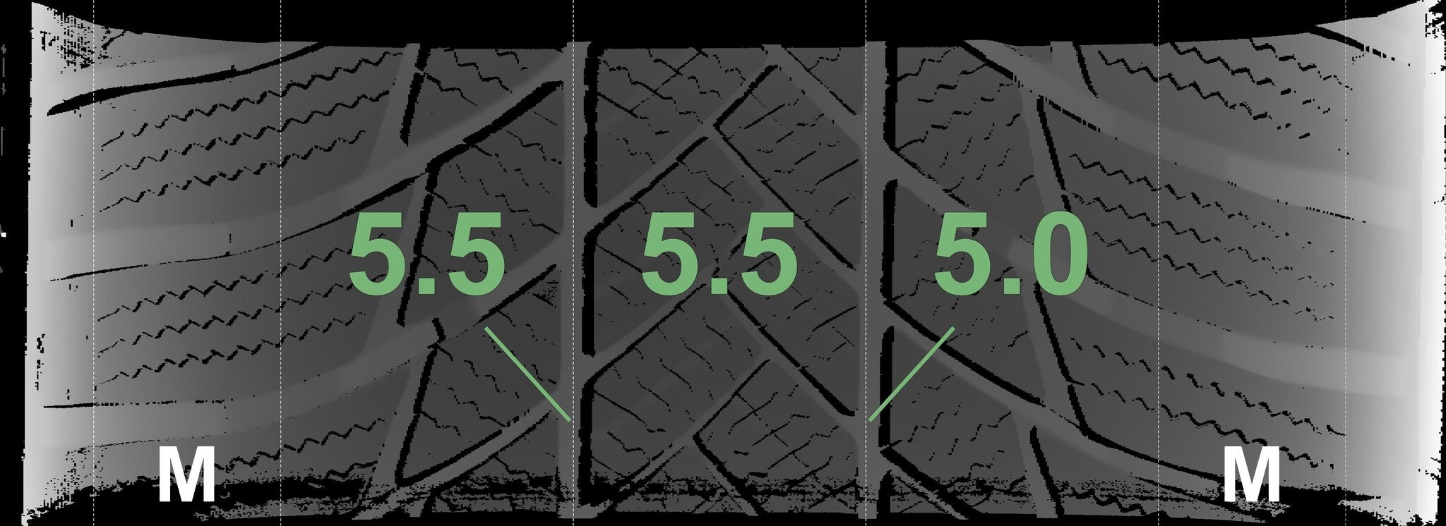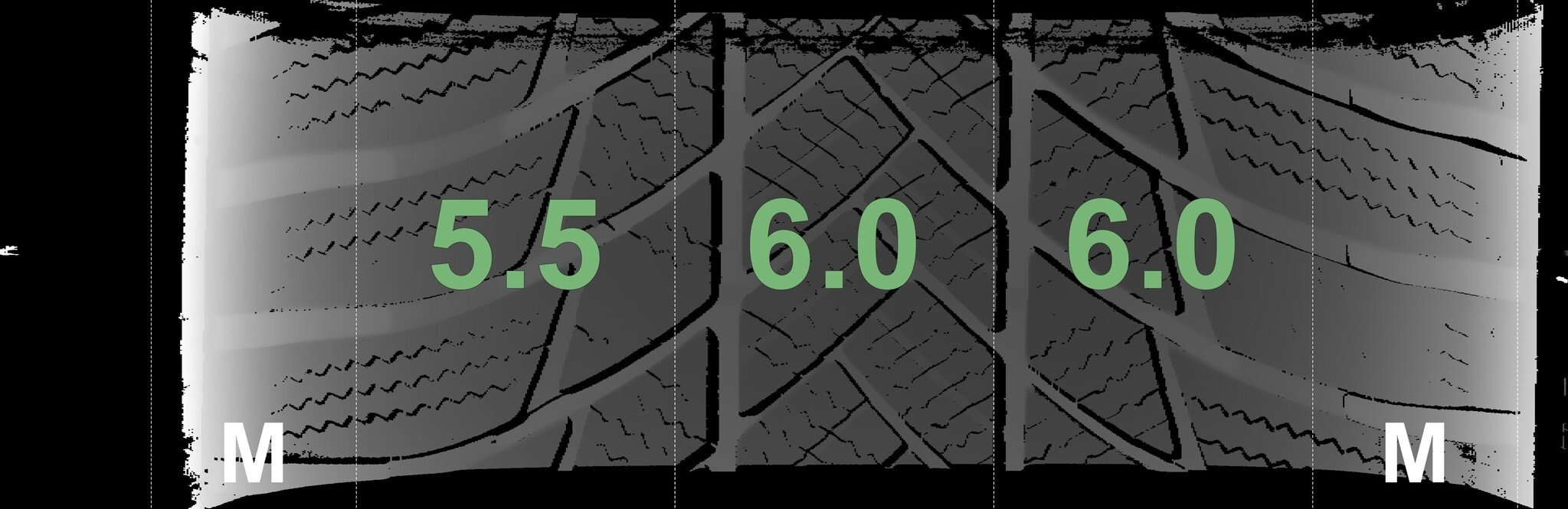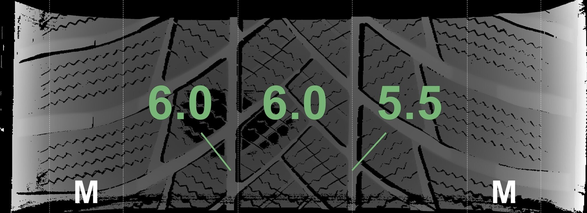 Die gemessenen Profiltiefen und die Details der Felgen sind oben angegeben.
