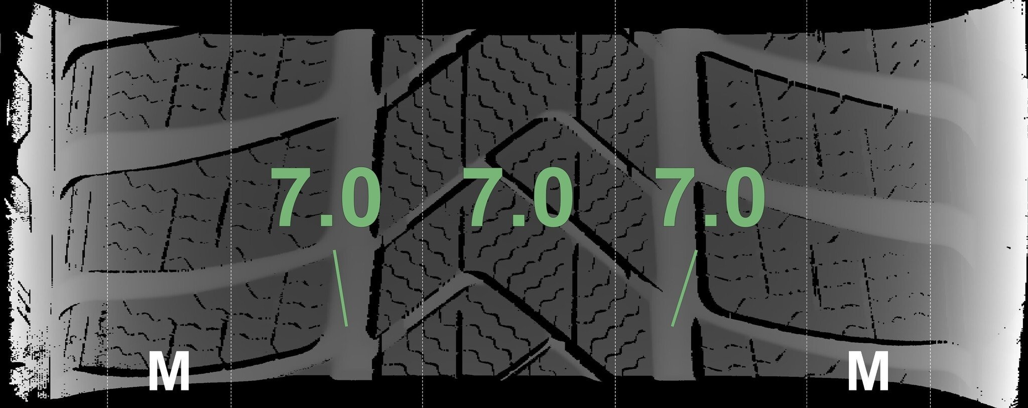 | Zustand | Profiltiefe | DOT | Vorderachse Rechts | Neu | 7,0 mm | 2522 |