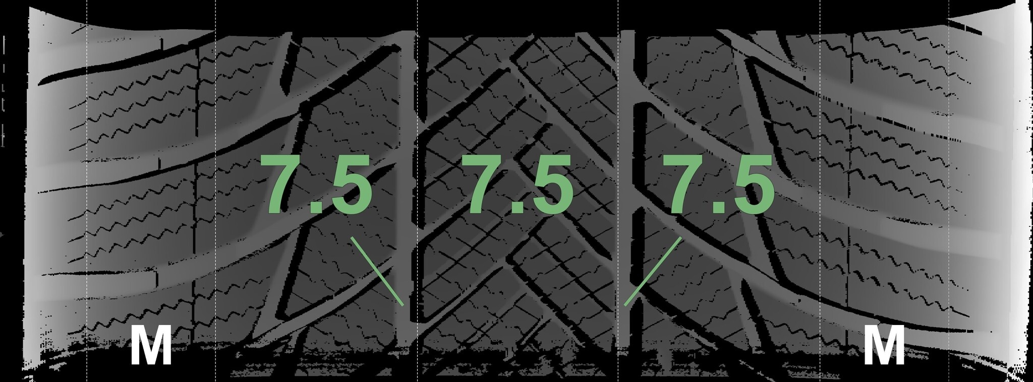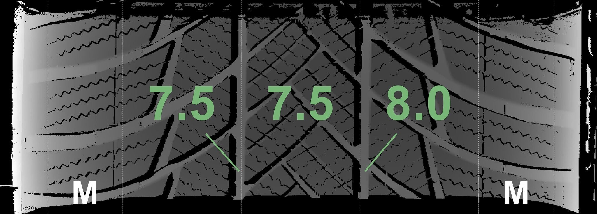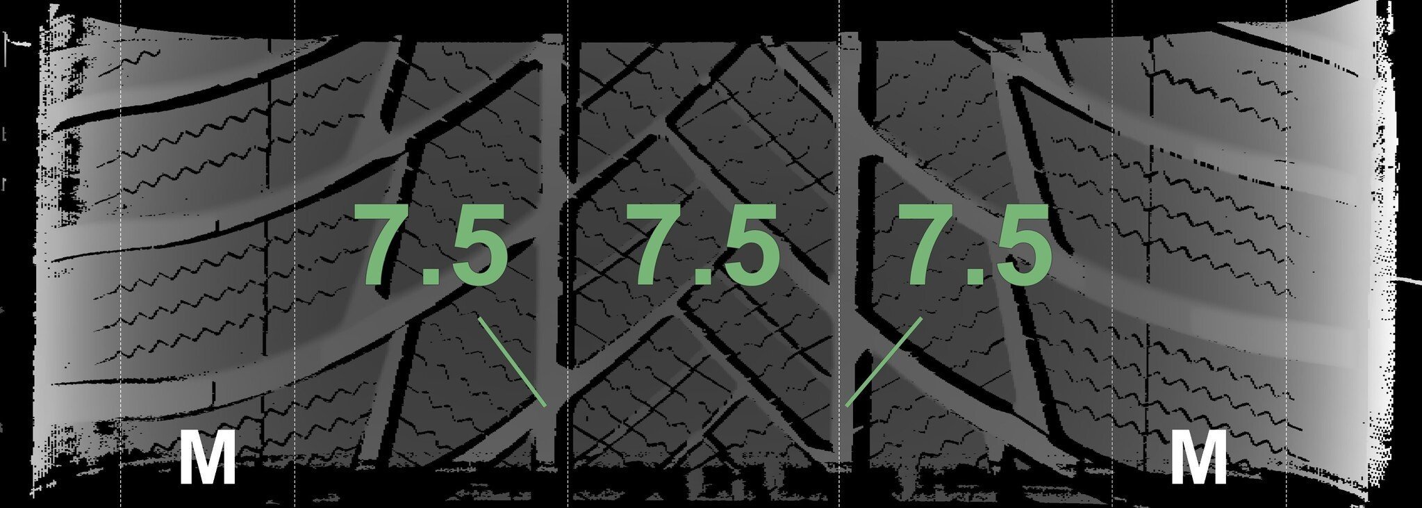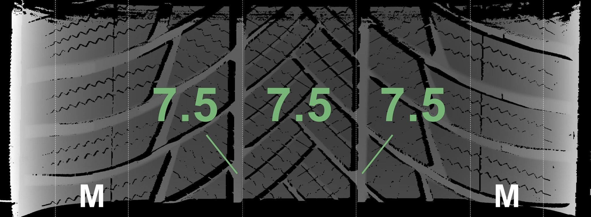 | Zustand | Profiltiefe | DOT | Vorderachse Rechts | Neu | 7,5 mm | 4425 |