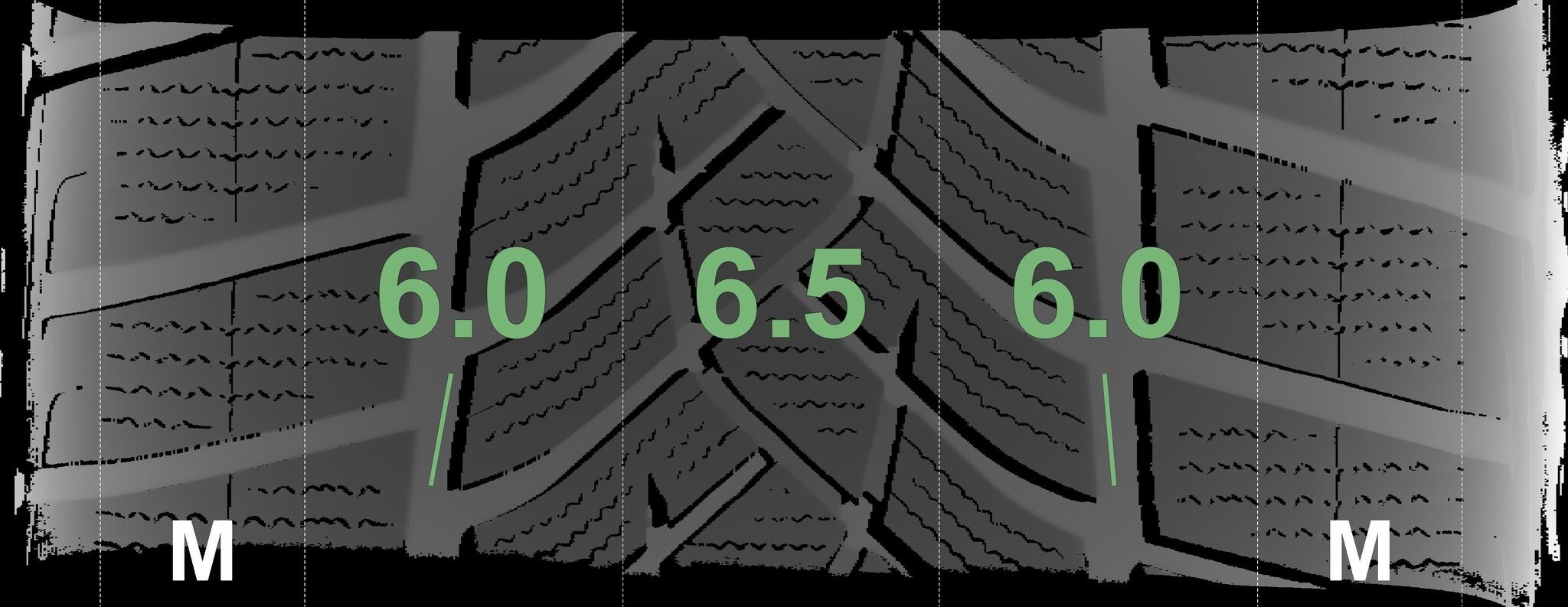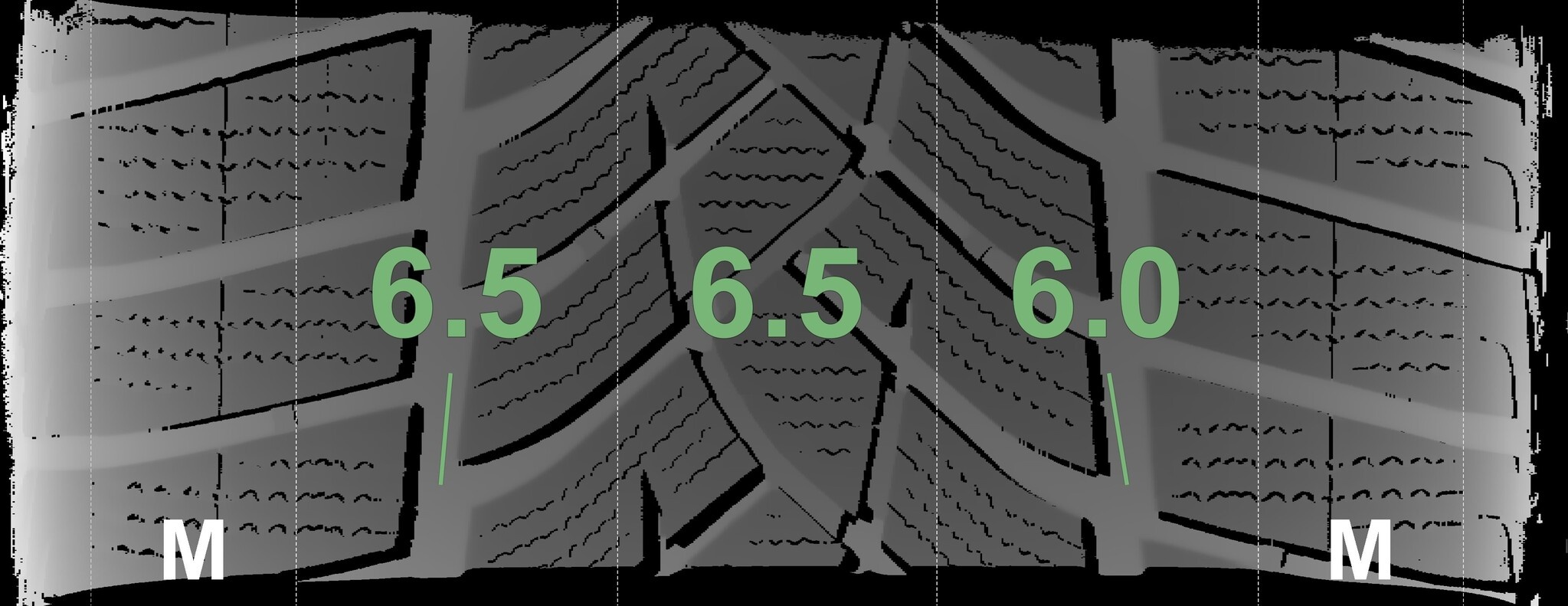 Die gemessenen Profiltiefen und die Details der Felgen sind oben angezeigt.