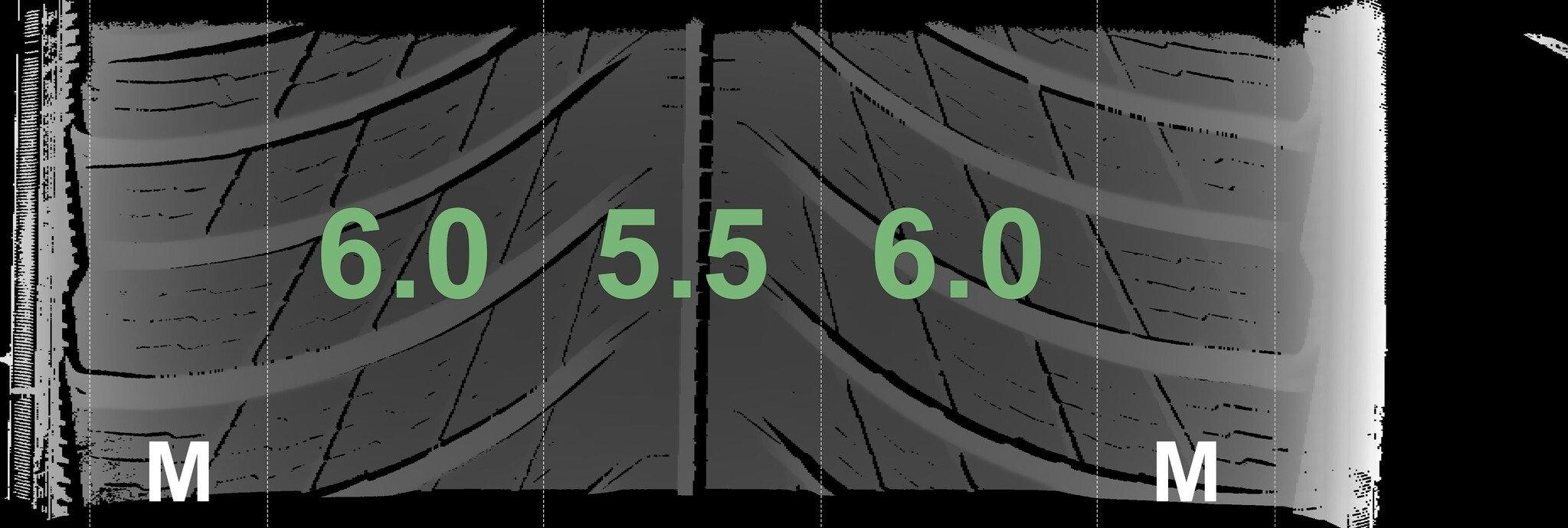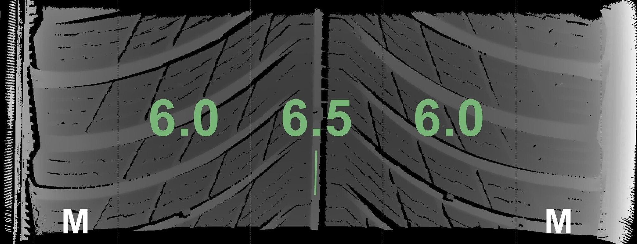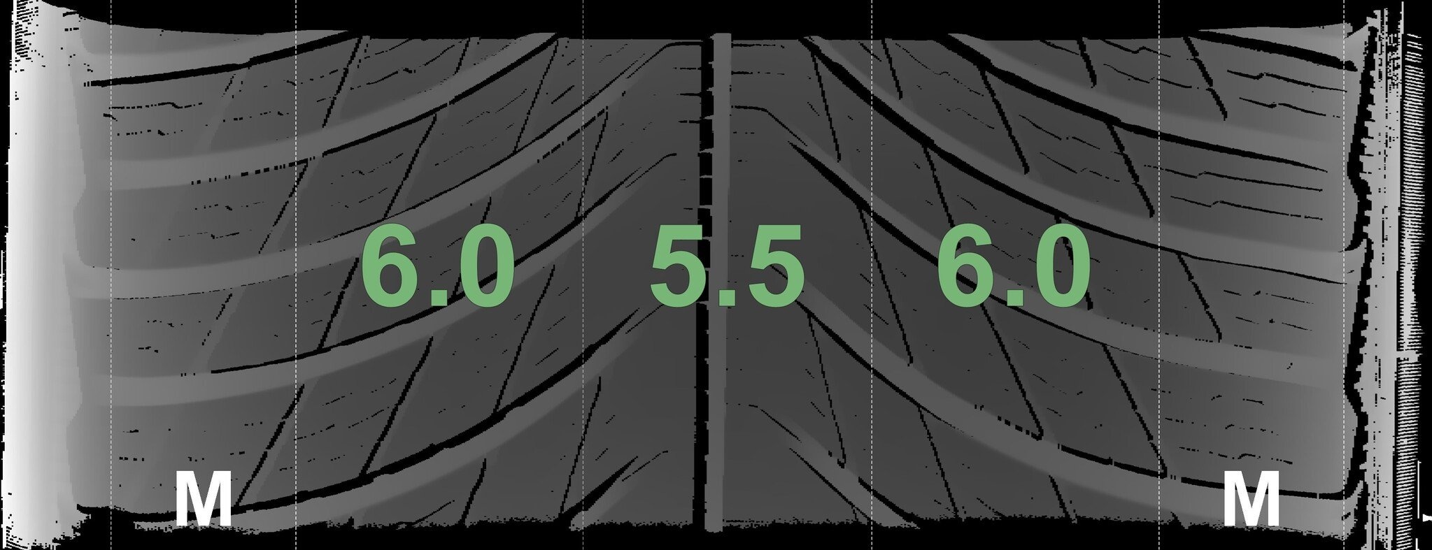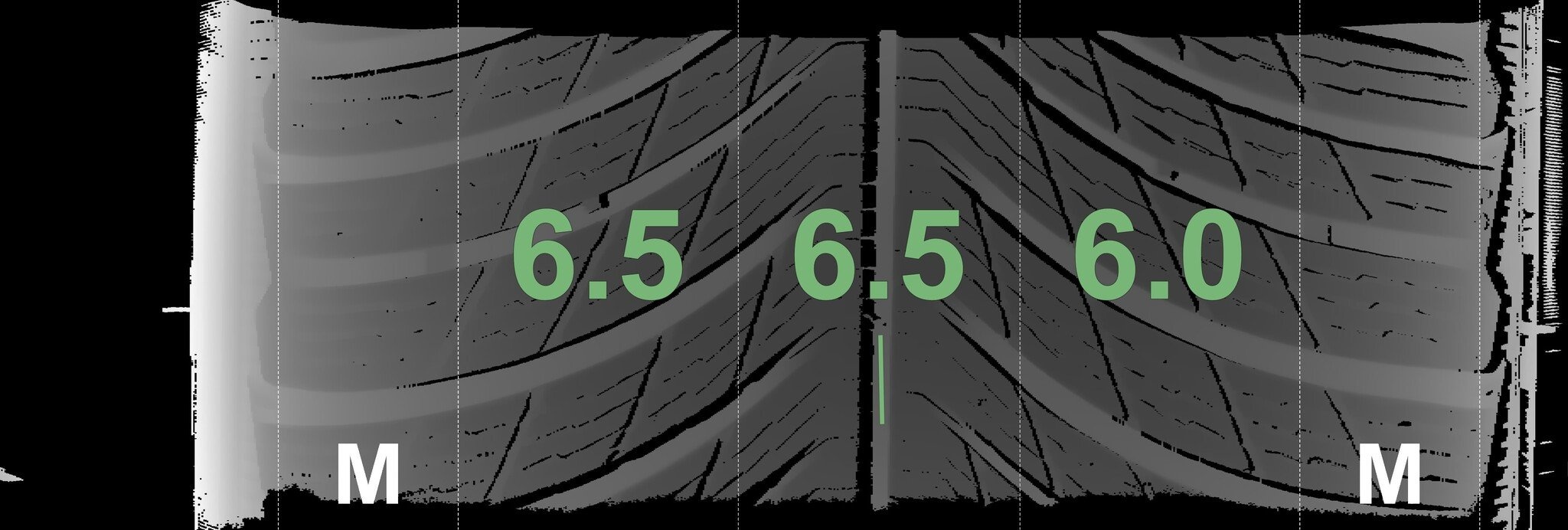 Die gemessenen Profiltiefen und die Details der Felgen sind oben dargestellt.