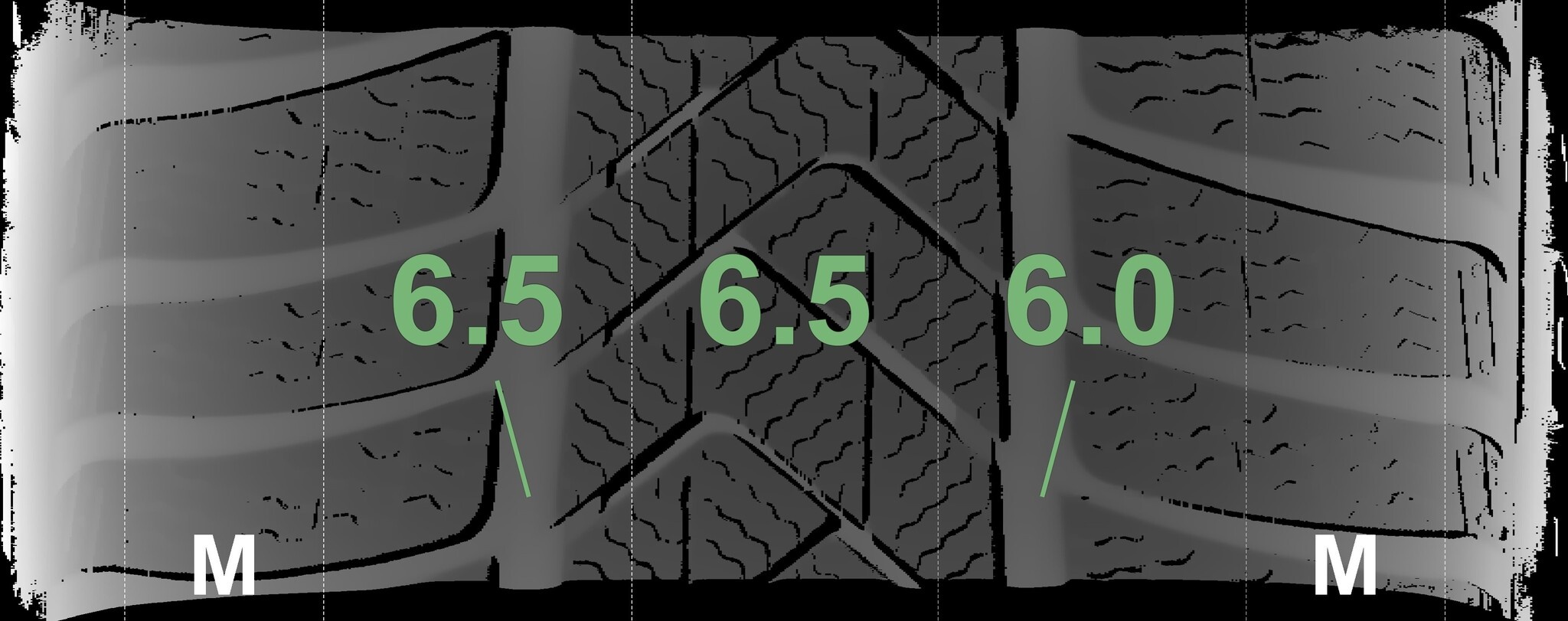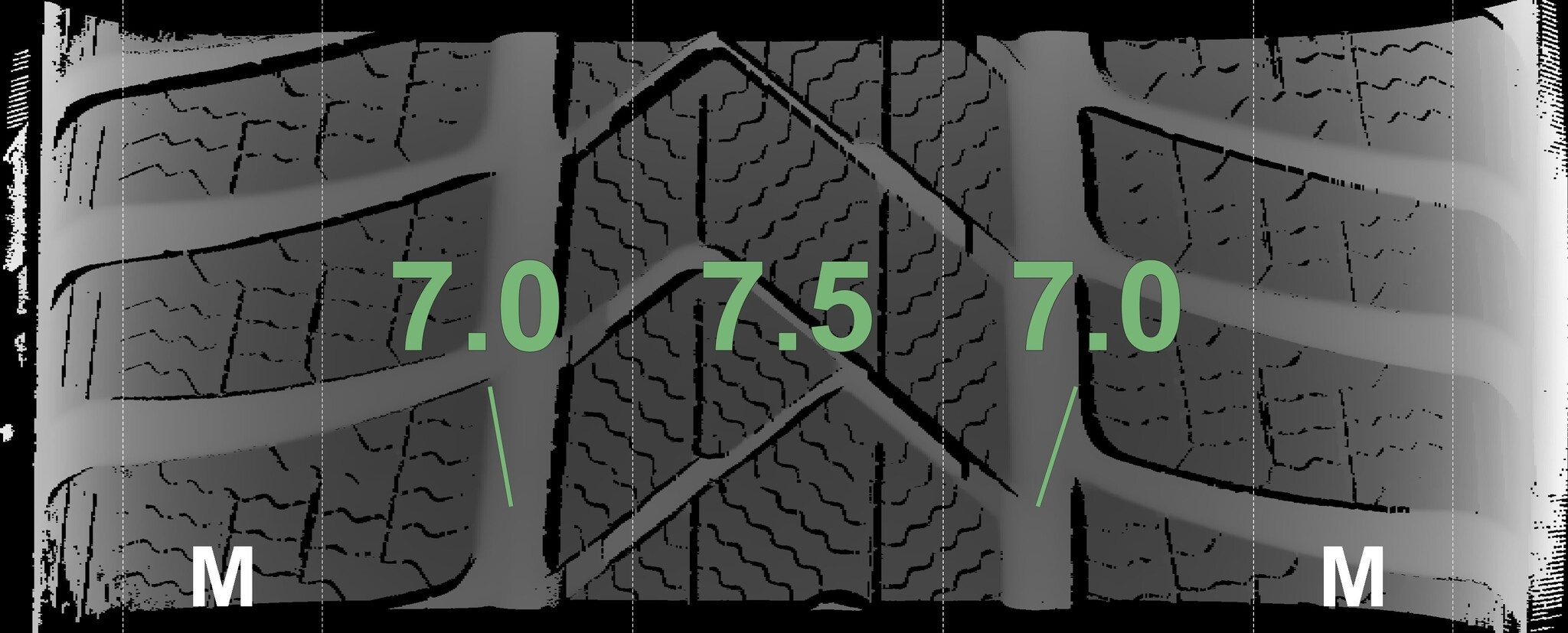 Die gemessenen Profiltiefen und die Details der Felgen sind oben dargestellt.