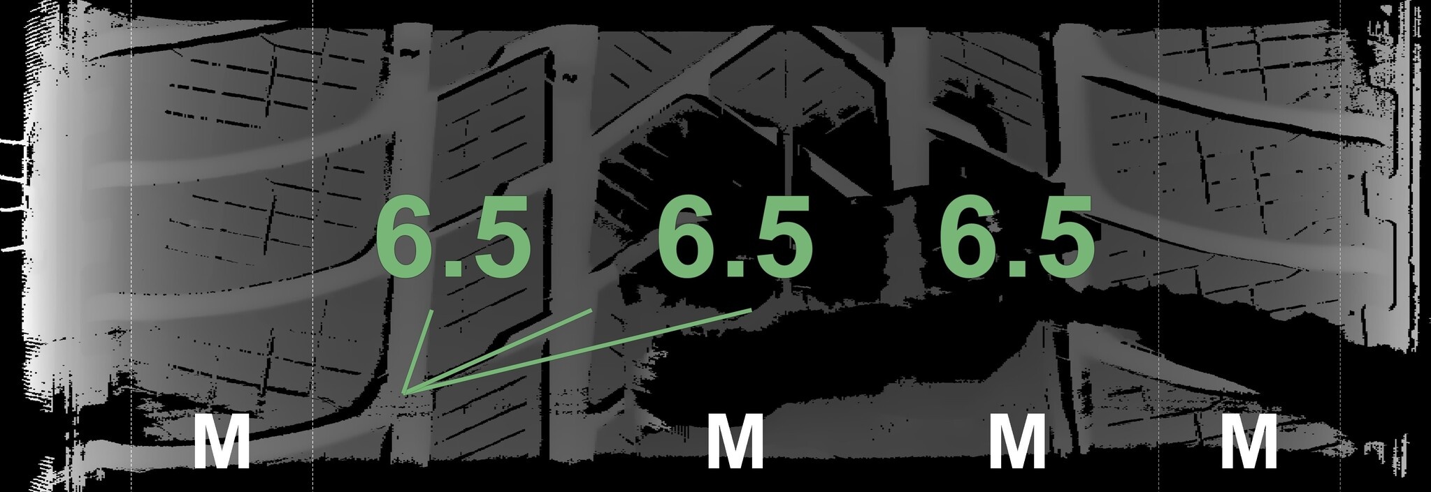 Zustand | Profiltiefe | DOT | Hinterachse Links | Gebraucht | 6,5 mm | 2520 |