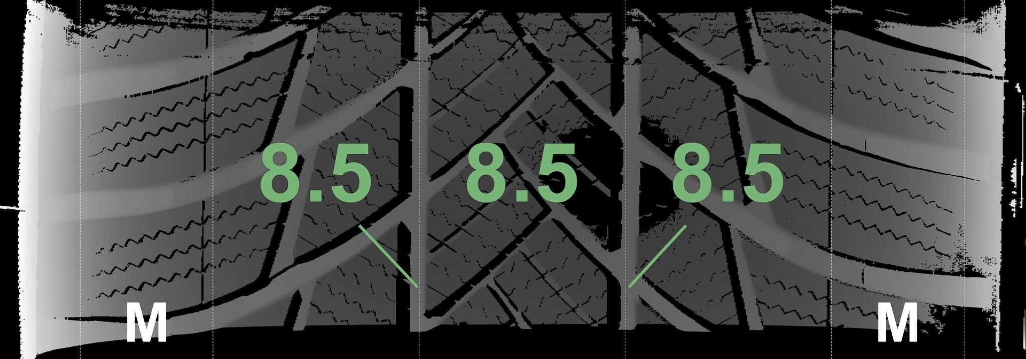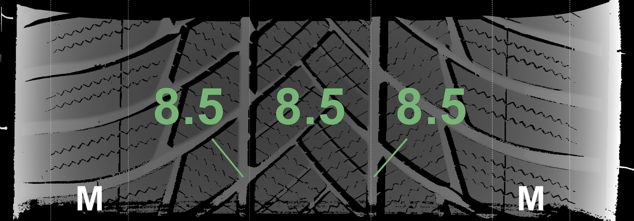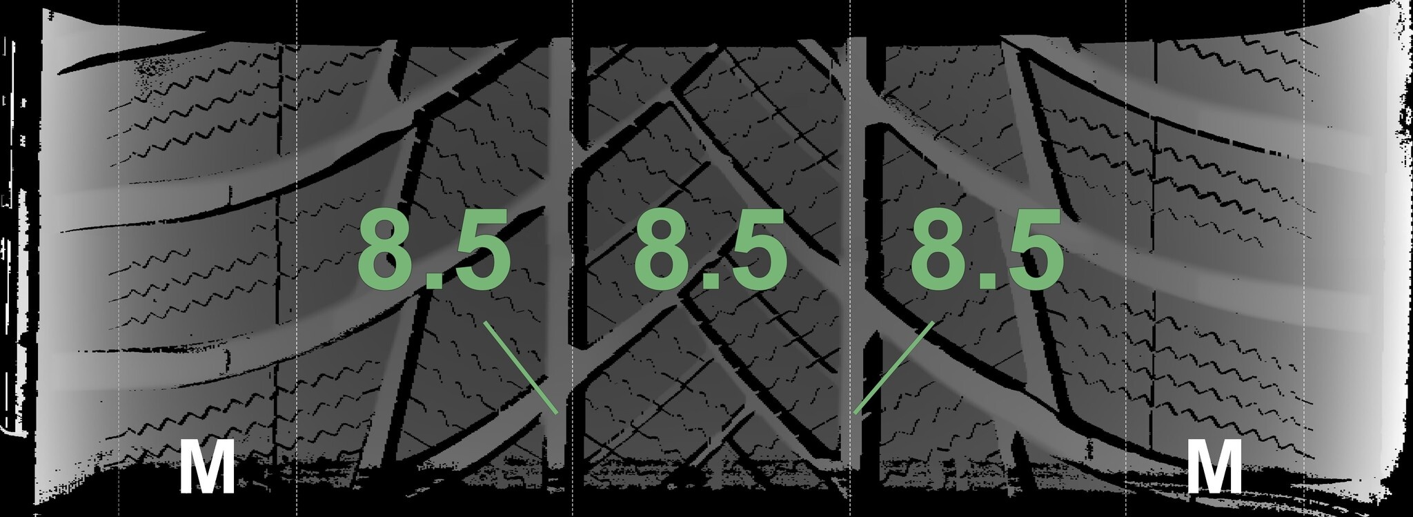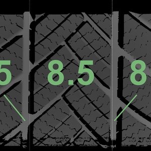 | Zustand | Profiltiefe | DOT | Vorderachse Links | Neu | 8.5 mm | 3925 |