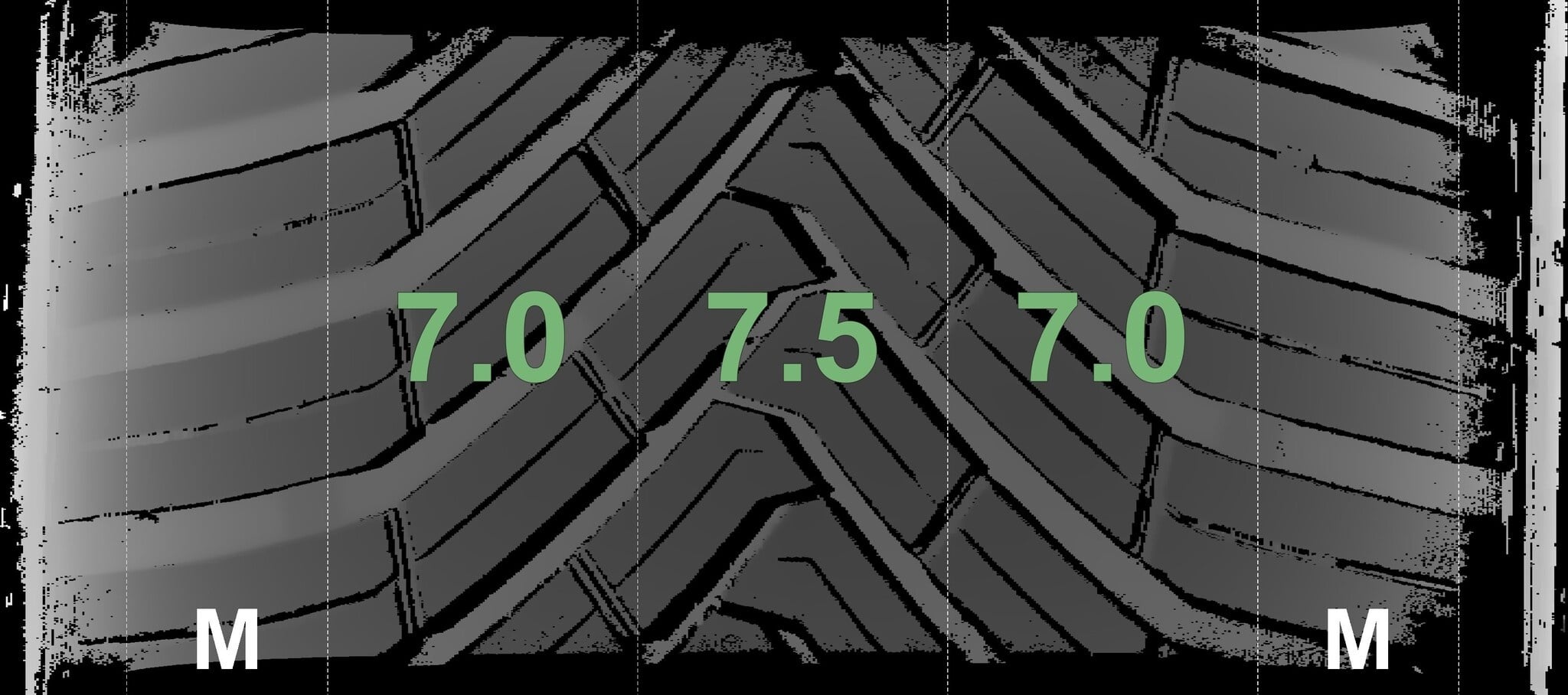 Die gemessenen Profiltiefen und die Details der Felgen sind oben angegeben.