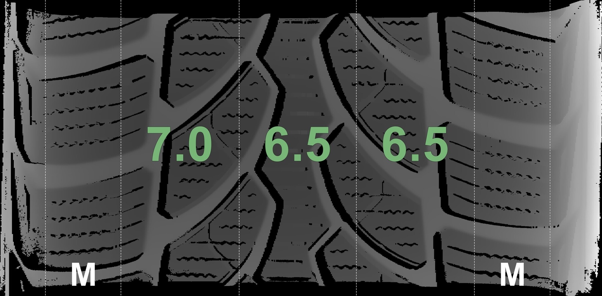 Die gemessenen Profiltiefen und die Details der Felgen sind oben dargestellt.