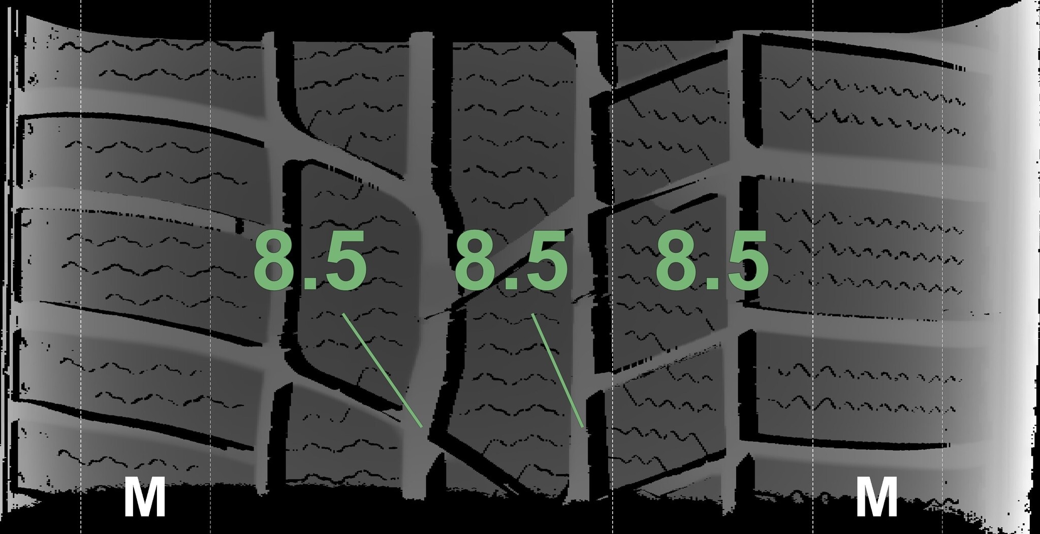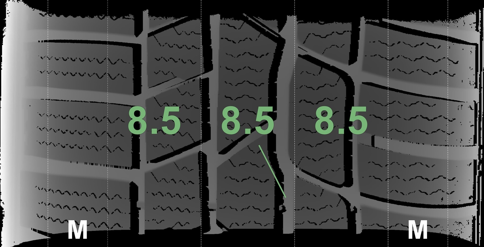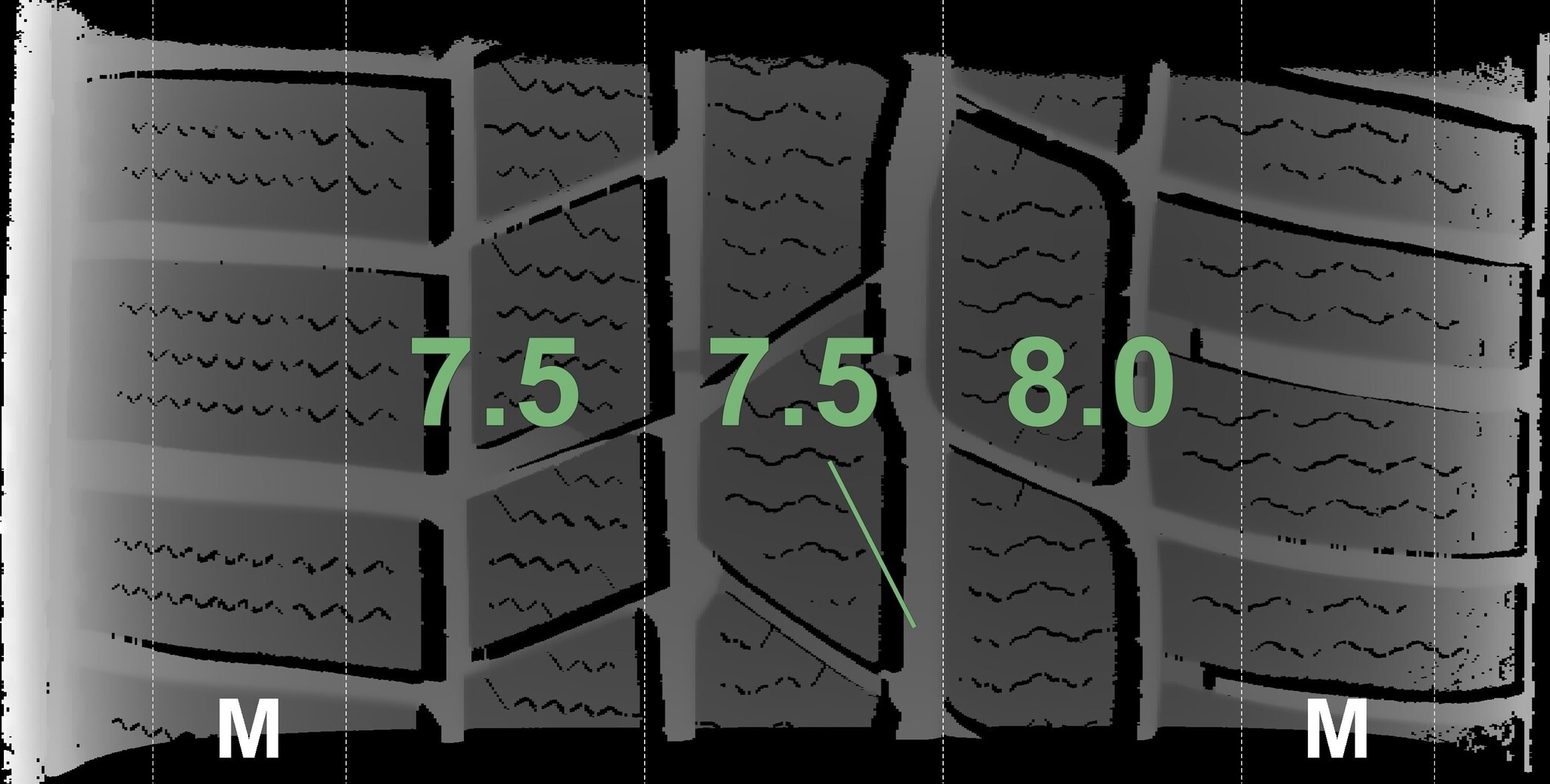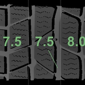 Die gemessenen Profiltiefen und die Details der Felgen sind oben dargestellt.