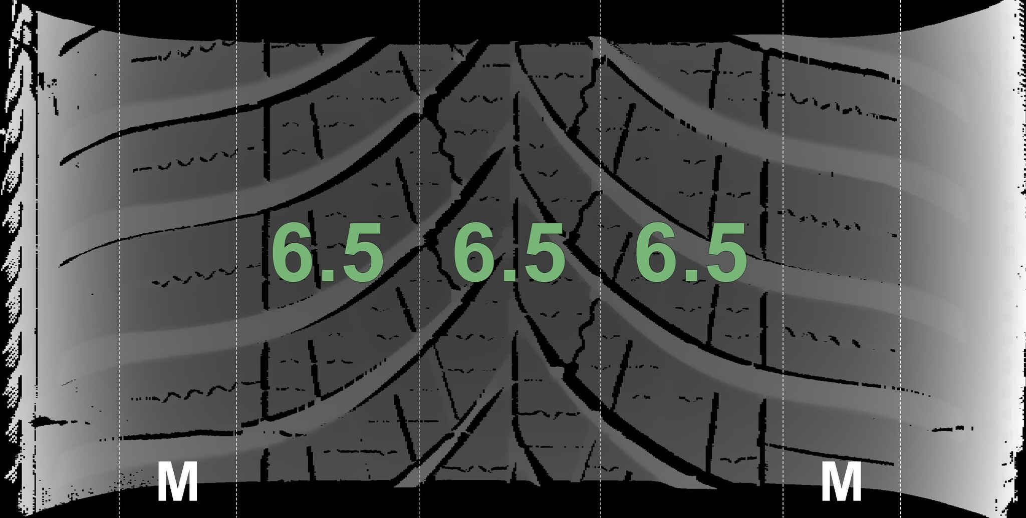 | Zustand | Profiltiefe | DOT | Vorderachse Links | Gebraucht | 6,5 mm | 4619 |