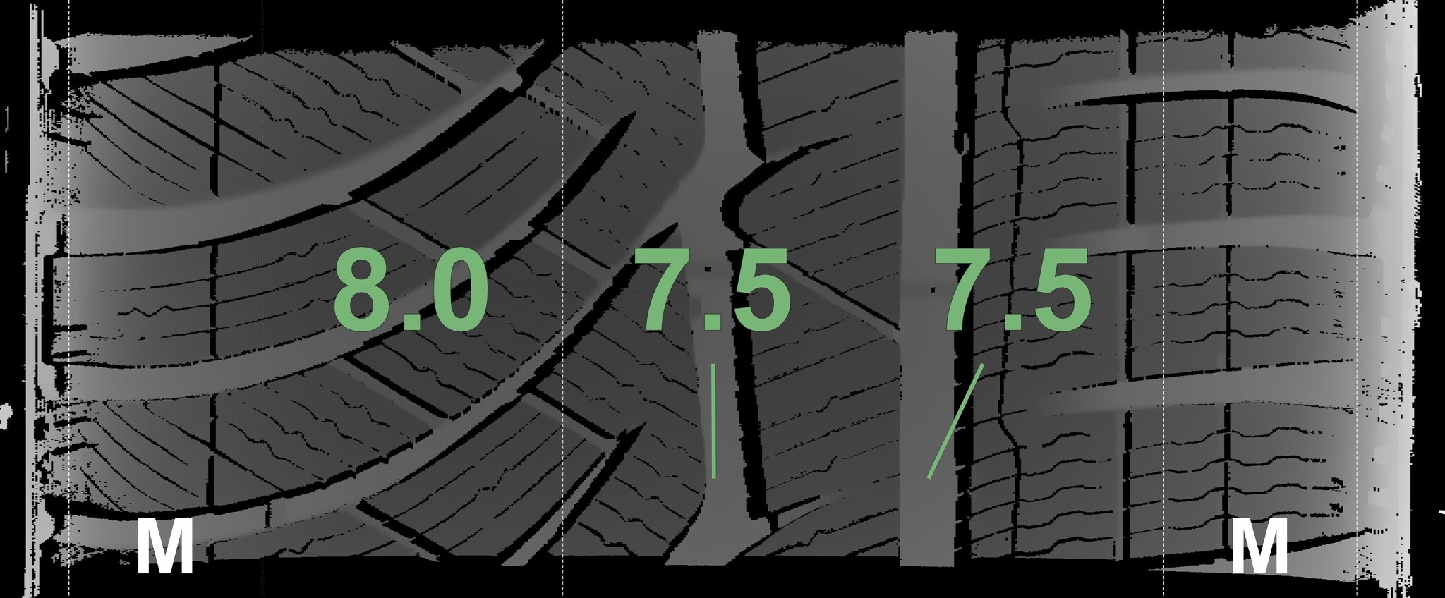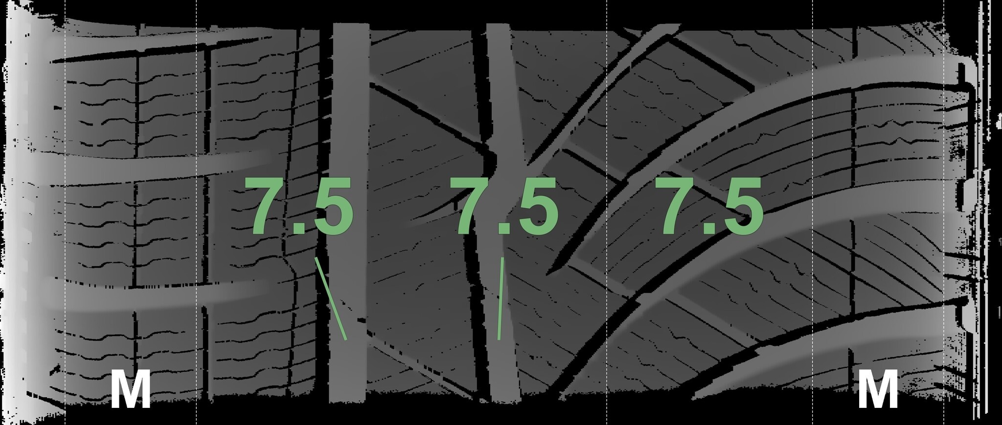 Zustand | Profiltiefe | DOT | Vorderachse Links | Gebraucht | 7,5 mm | 4020 |