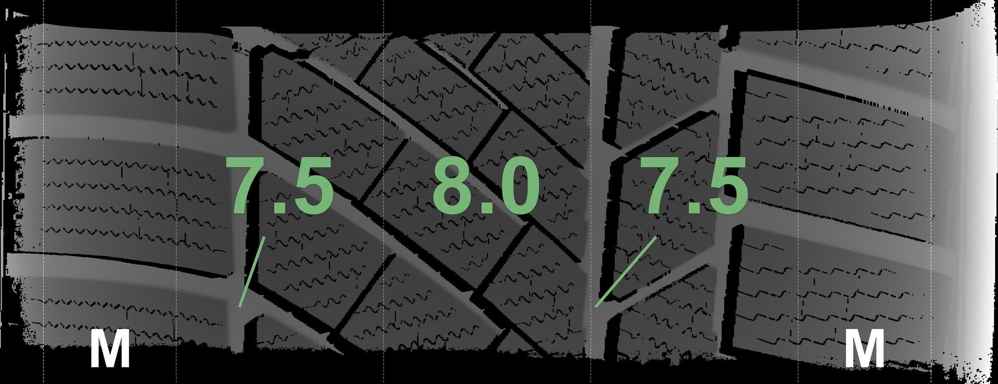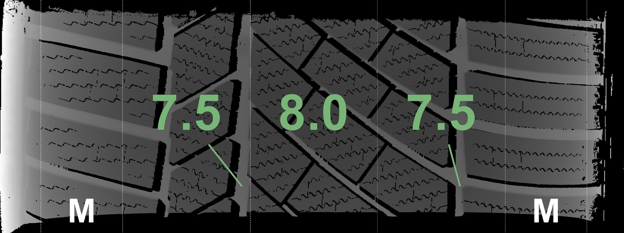 | Zustand | Profiltiefe | DOT | Hinterachse Rechts | Neu | 7,5 mm | 2822 |