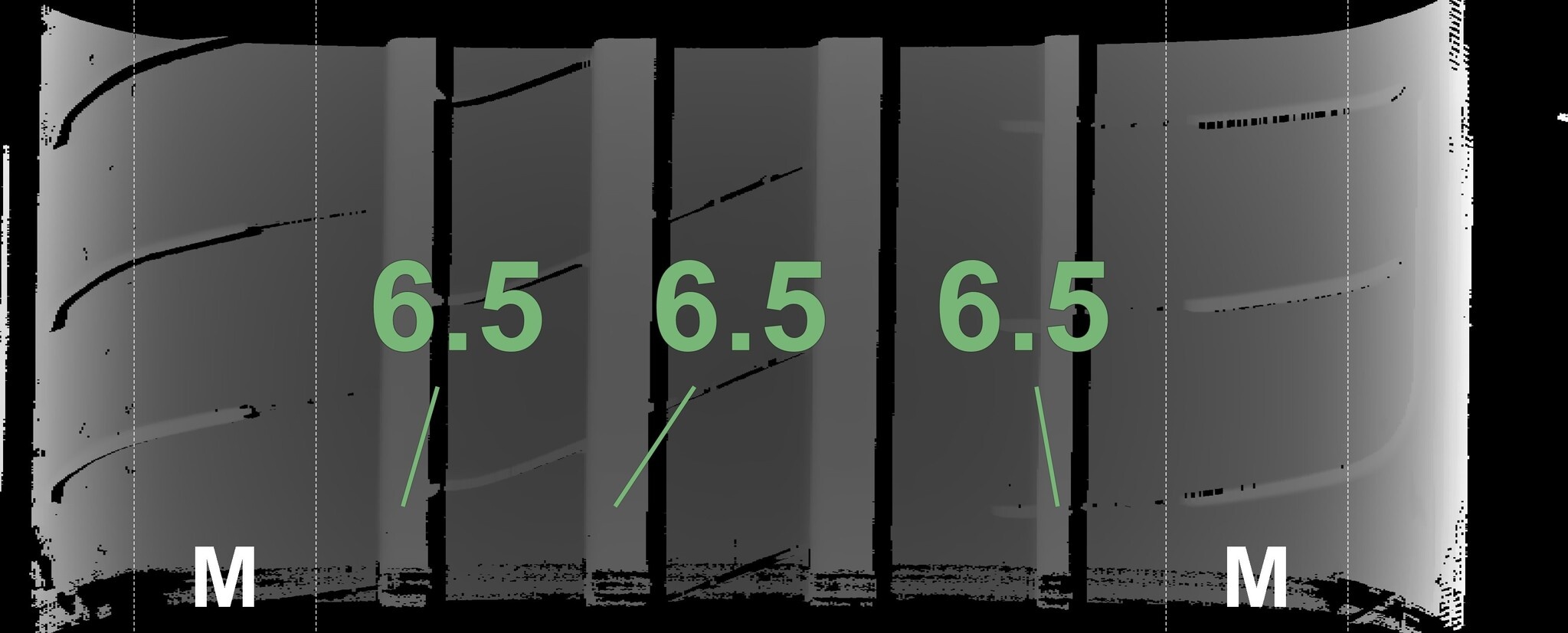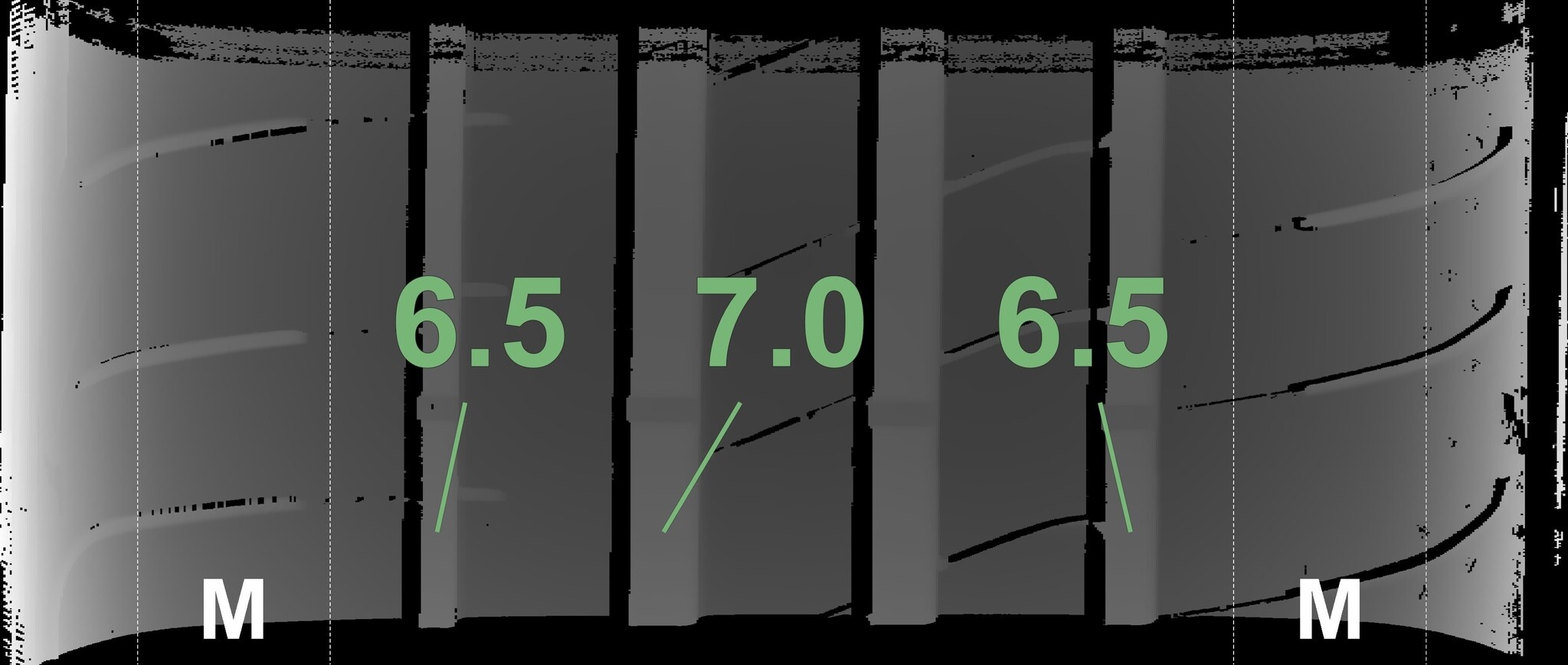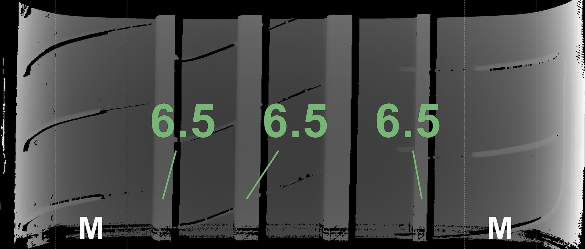 | Zustand | Profiltiefe | DOT | Hinterachse Links | Demo-Noppen noch sichtbar | 6.5 mm | 1022 |